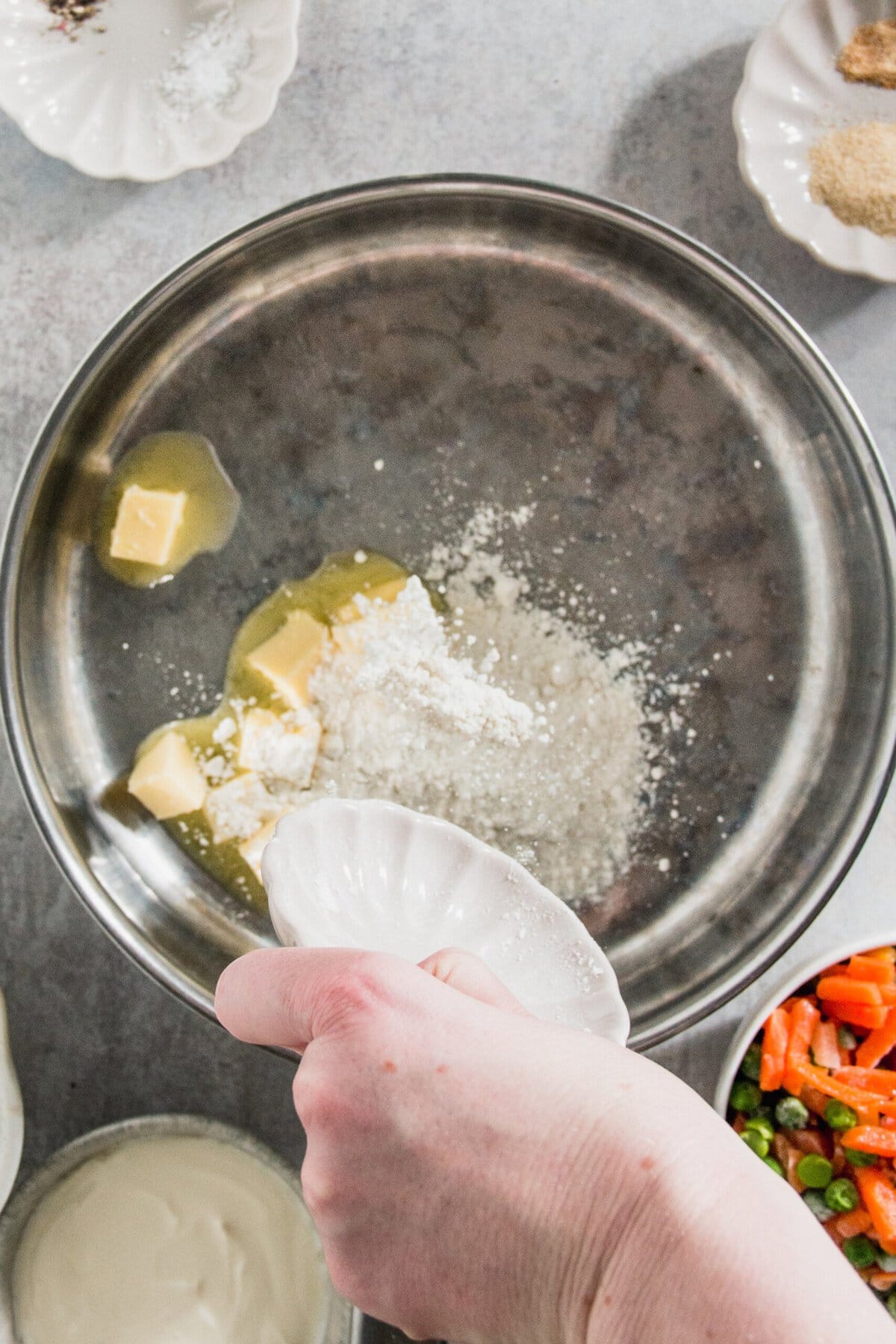 - In a medium pot, over medium heat whisk butter, flour, and seasonings to form a roux. Cook a couple minutes, whisking frequently.