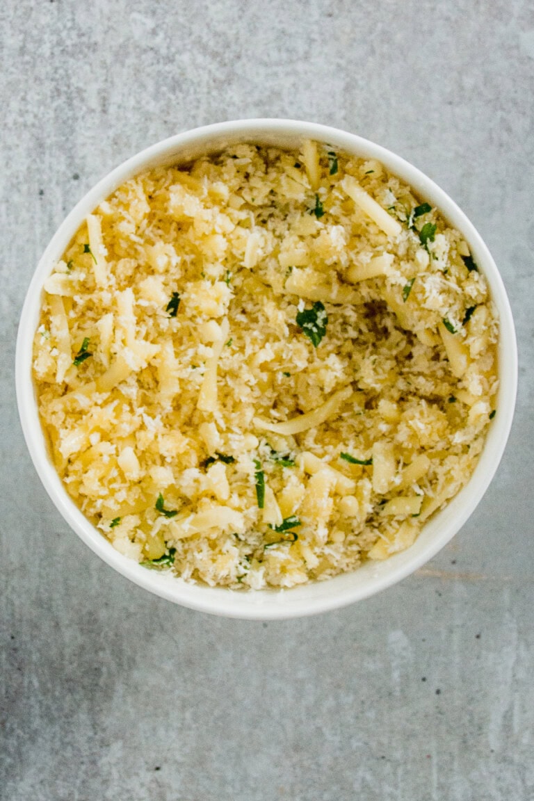 - In a small bowl combine panko bread crumbs, melted butter, parsley and cheese.