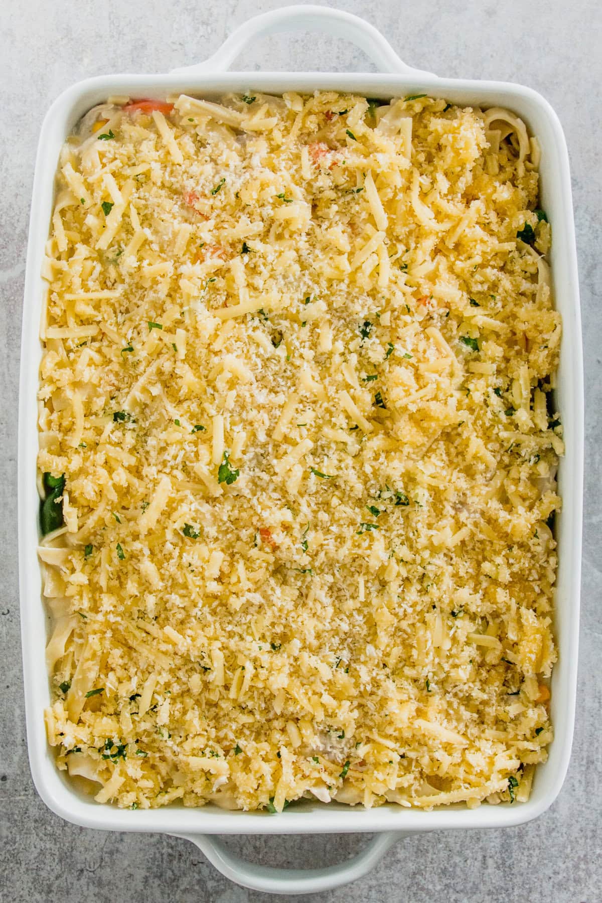 - Sprinkle bread crumb mixture over top of casserole, evenly distributing.