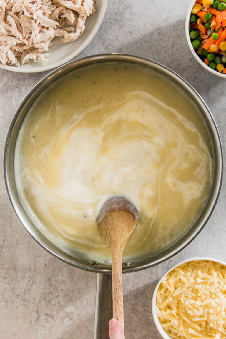 Combine sauce with cooked noodles, frozen veggies, chicken and cheese and leave on heat just until heated through.
