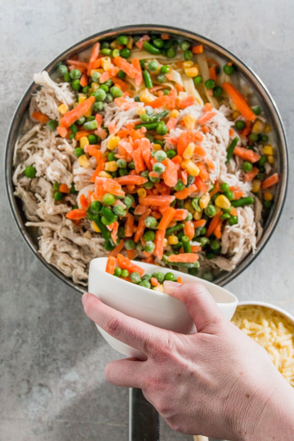 The whole family (yes even your picky eater) will love this cheesy chicken noodle casserole and you’ll love how quickly this meal comes together! This easy weeknight meal includes shredded chicken, cheddar cheese, mixed vegetables and egg noodles that are tossed together with a creamy homemade sauce. No canned cream of chicken soup needed here!