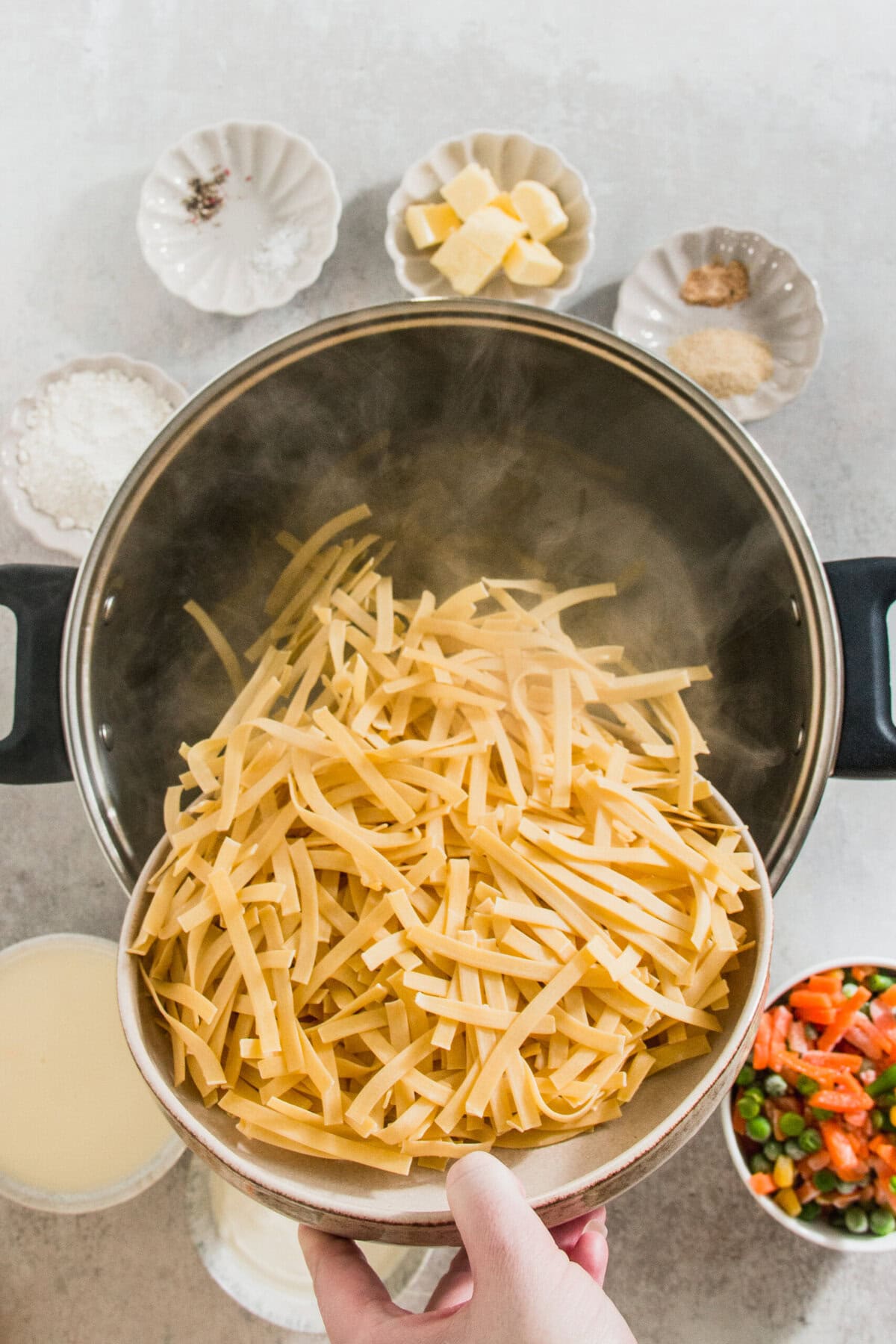 - Bring a large pot of salted water to boil. Cook egg noodles according to package directions for al dente and drain. Set aside.
