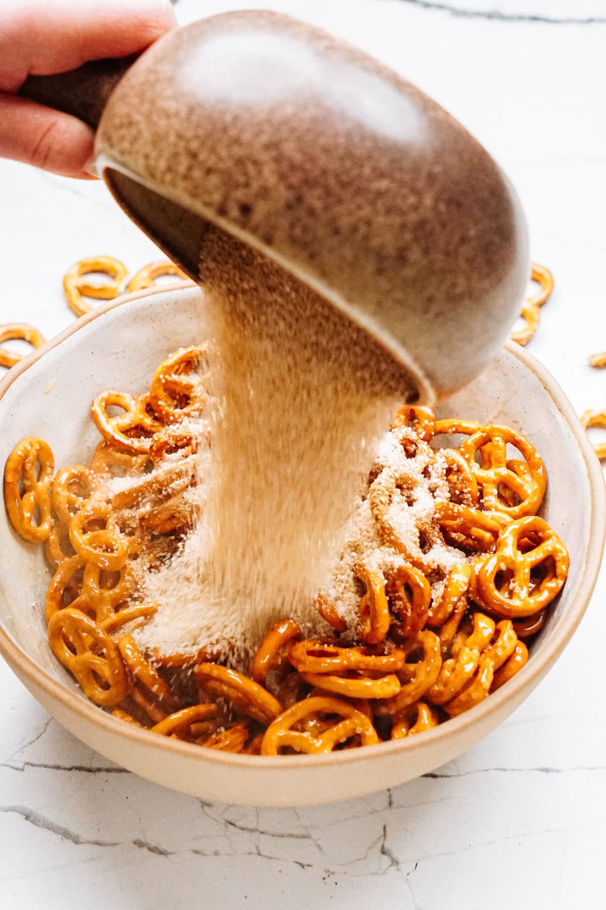 - In a small bowl, stir sugar and cinnamon together then toss with buttered pretzels.