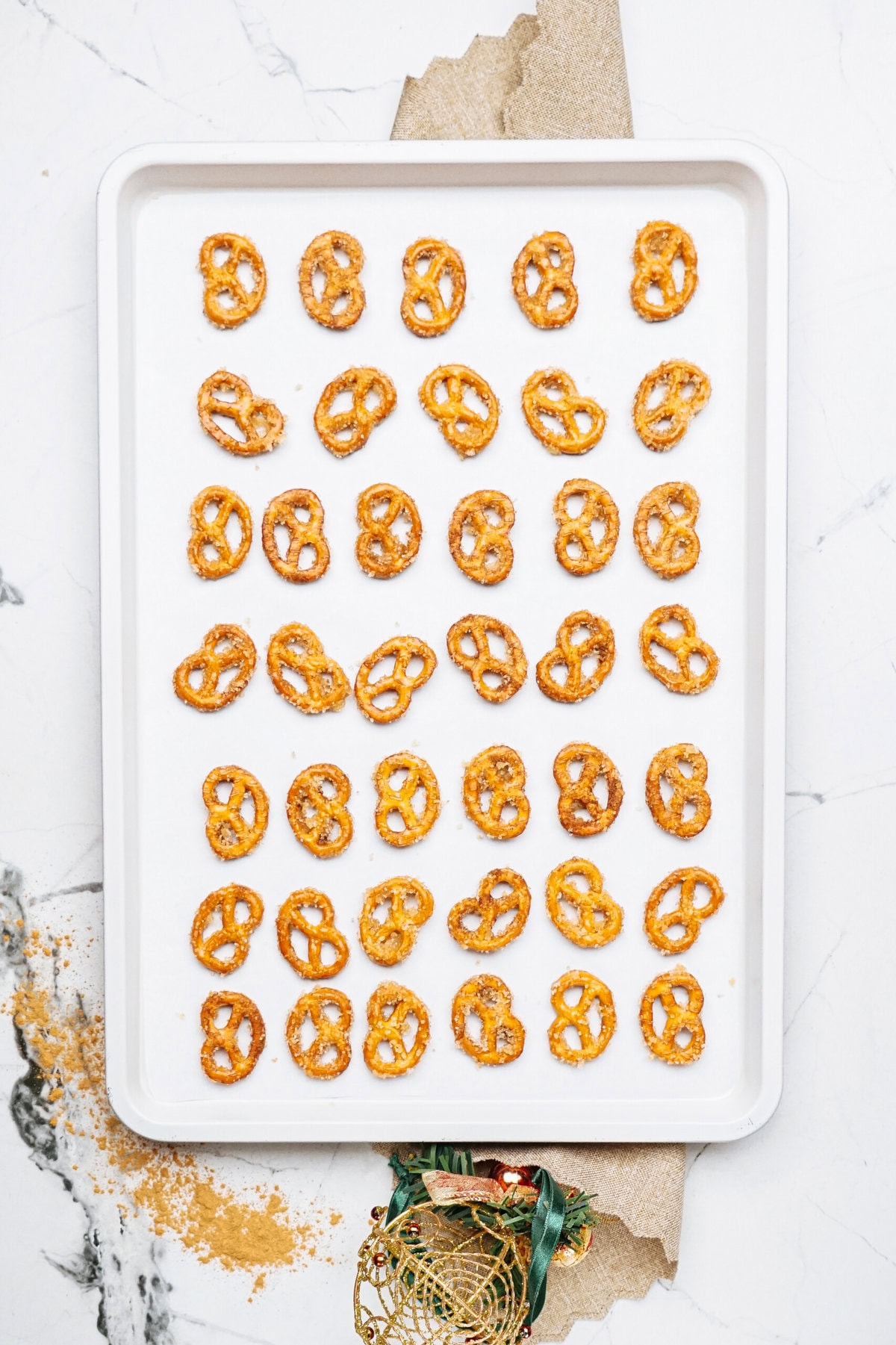 - Spread pretzels out in an even layer on prepared baking sheet and bake 12 minutes. Remove from oven and cool 10 minutes.