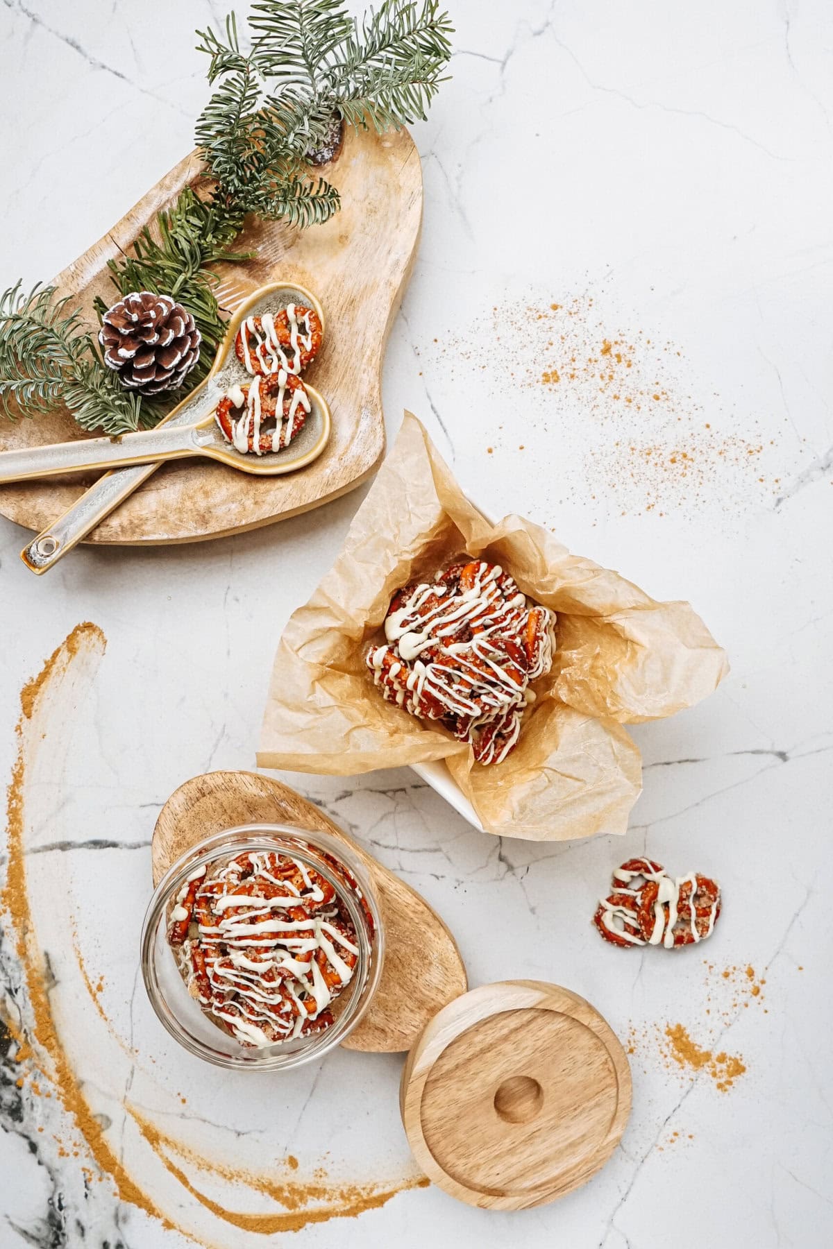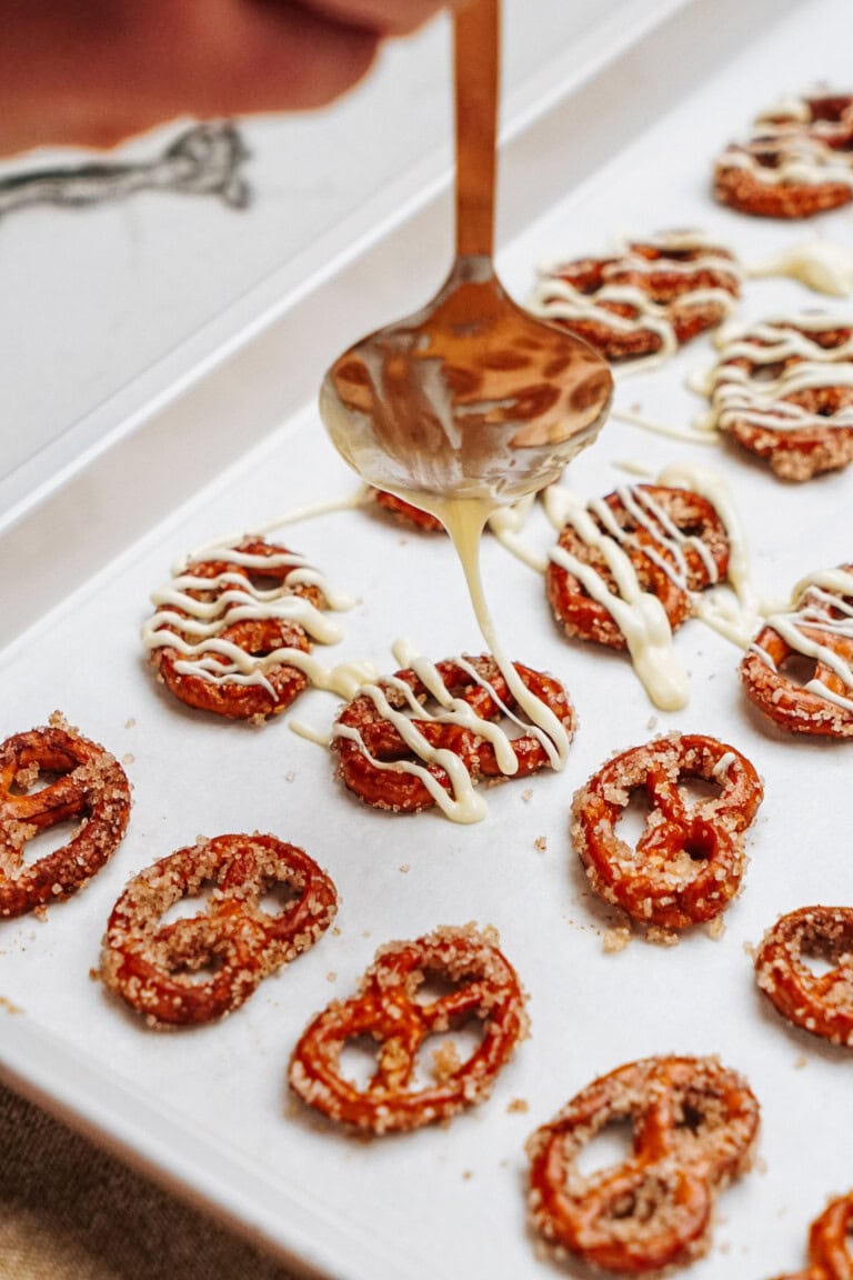If you’re a fan of cinnamon rolls or homemade soft pretzels, this mashup will quickly become one of your favorite snacks. It’s an easy recipe that requires simple ingredients you likely already have at home, and it comes together in less time than it takes to bake a batch of cookies. The best part? The white chocolate drizzle adds just the right amount of sweetness to balance the crunchy pretzels and cinnamon sugar coating. Plus, these are great gifts during the holiday season or a fun way to spend quality time with the entire family.