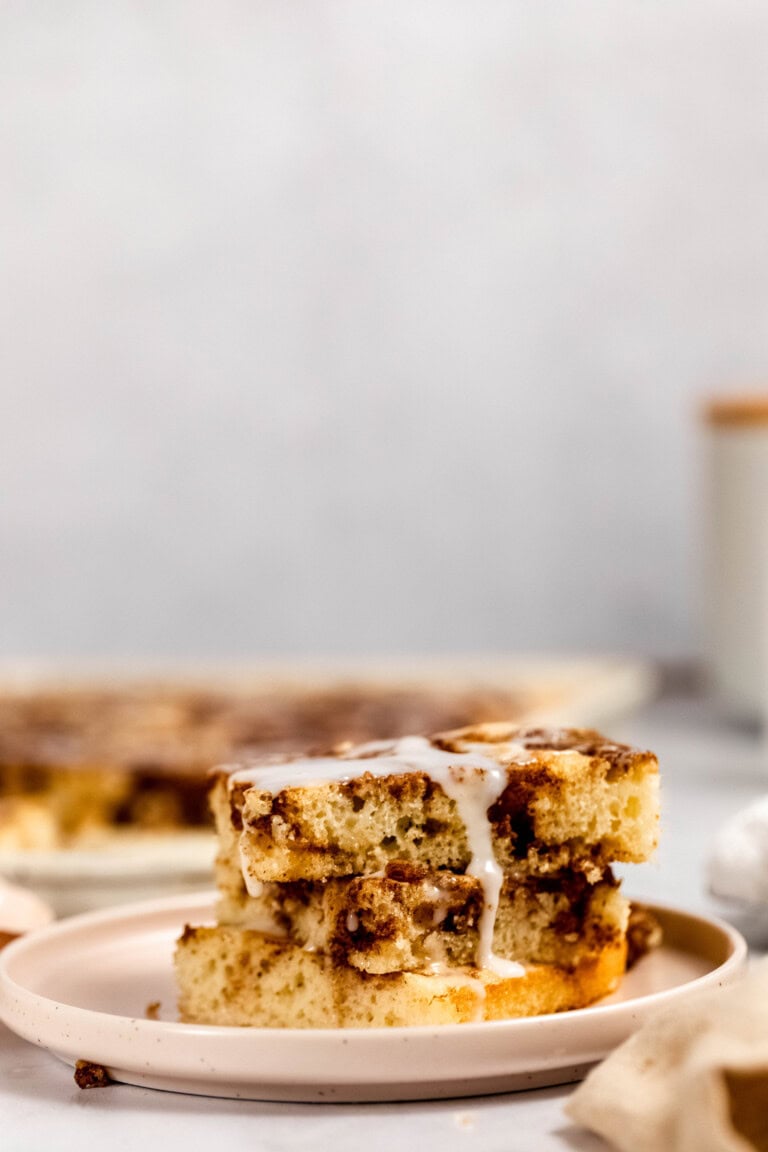 Remove from oven and cool 5-10 minutes. Drizzle the glaze over the warm cake. Serve warm for the best cinnamon flavor!