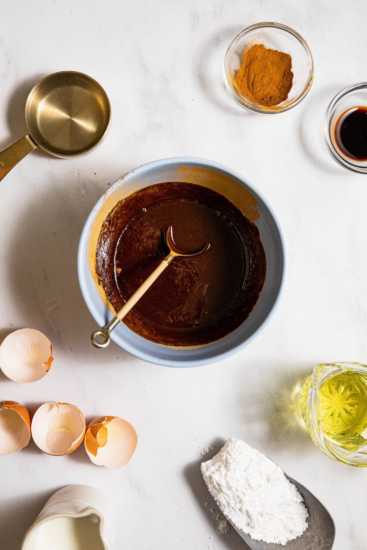 For full recipe details, including ingredient measurements see the printable recipe card below. Here are my step-by-step instructions for making this homemade cinnamon roll cake: