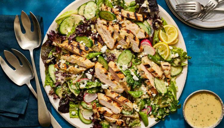 Juicy grilled chicken breasts, crunchy spring veggies, and a tangy tahini dressing combine for this satisfying salad.