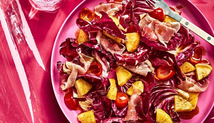 Serrano ham hugs bitter radicchio and juicy pineapple in this colorful, red curry vinaigrette–dressed salad.