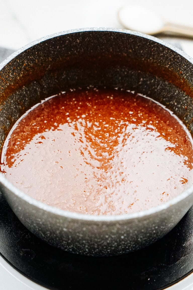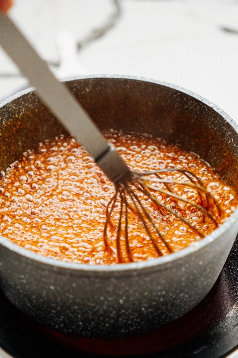 Pro Tip: If you notice sugar crystals forming on the sides of the pan. Use a pastry brush dipped in water to brush down the sides while cooking.