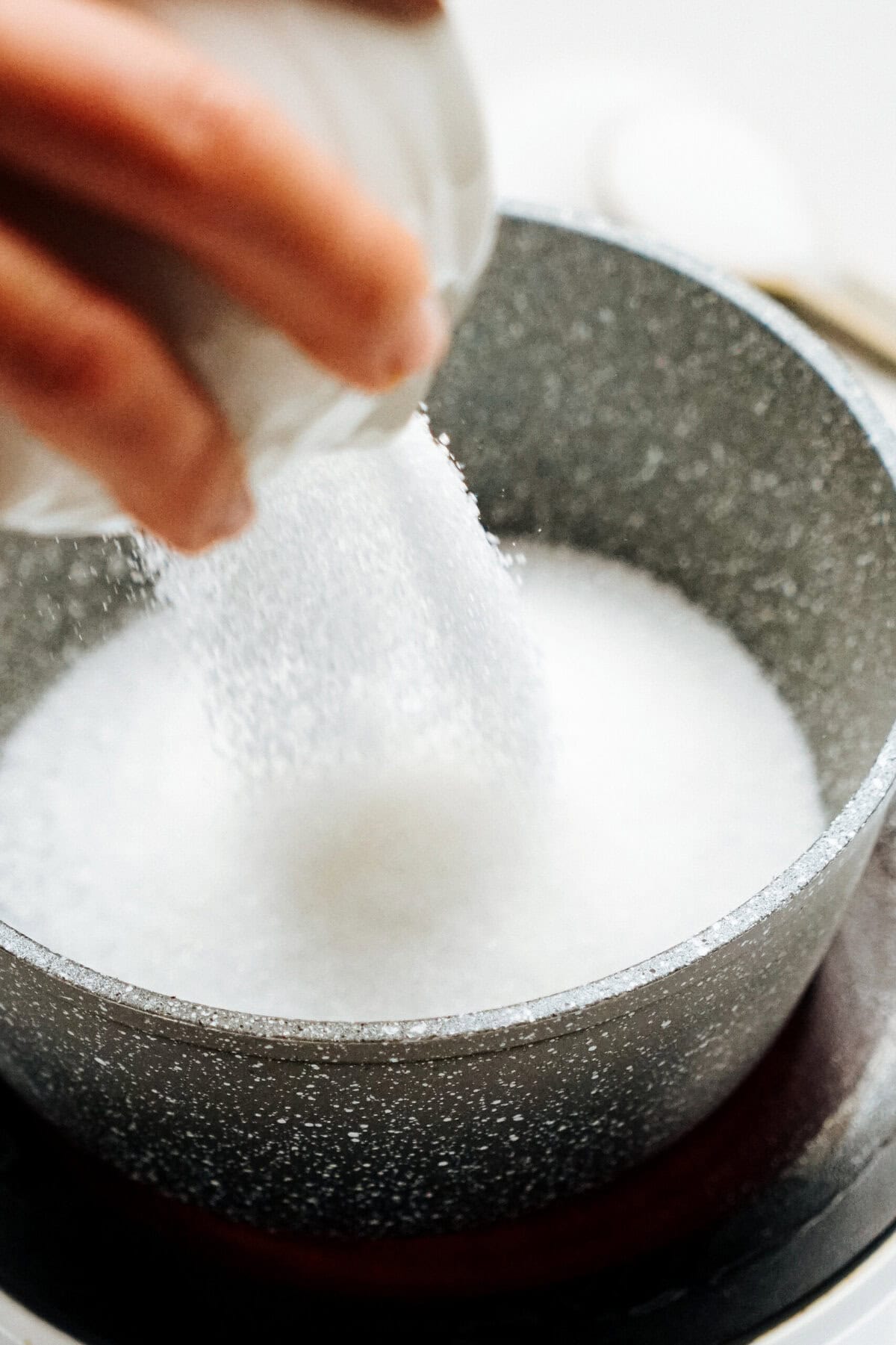 In a medium heavy-bottom saucepan, combine sugar and water over medium-low heat. Stir until the sugar dissolves and starts to bubble, swirling occasionally to avoid sugar crystals on the sides of the pan.