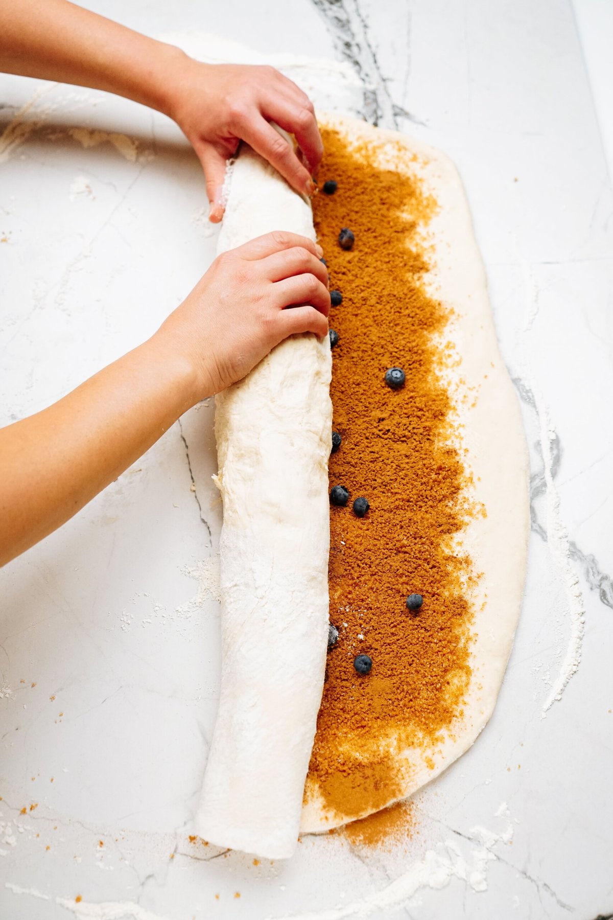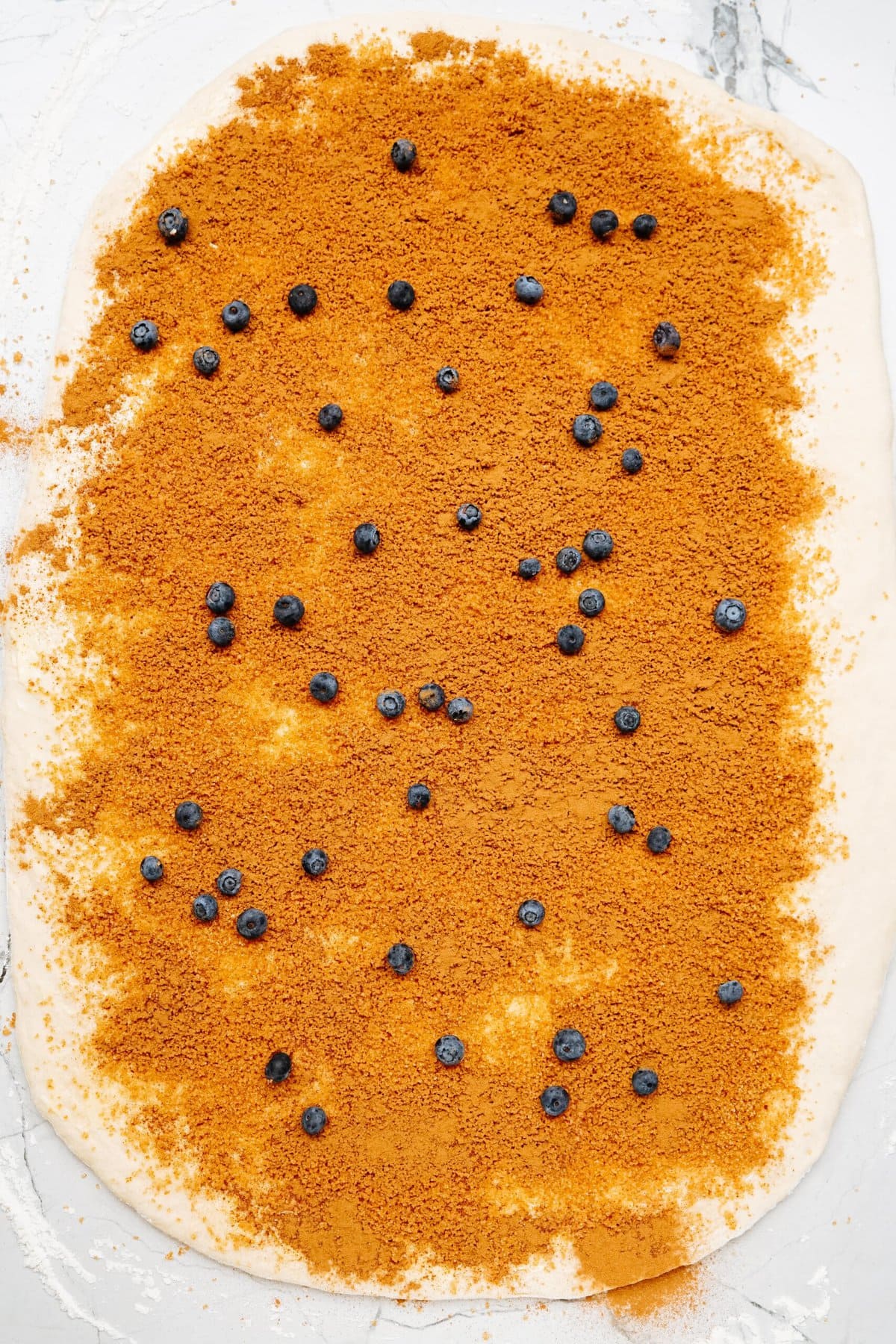 - Using your fingers, spread the soft butter over the entire piece of dough, leaving a 1 inch border along the top of a longer 24" side. Spread the brown sugar over the butter evenly and then sprinkle with cinnamon. Gently press the blueberries into the dough.