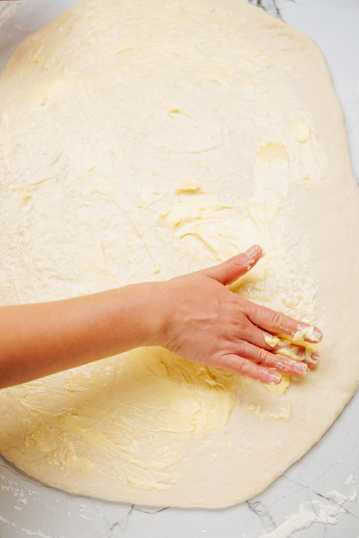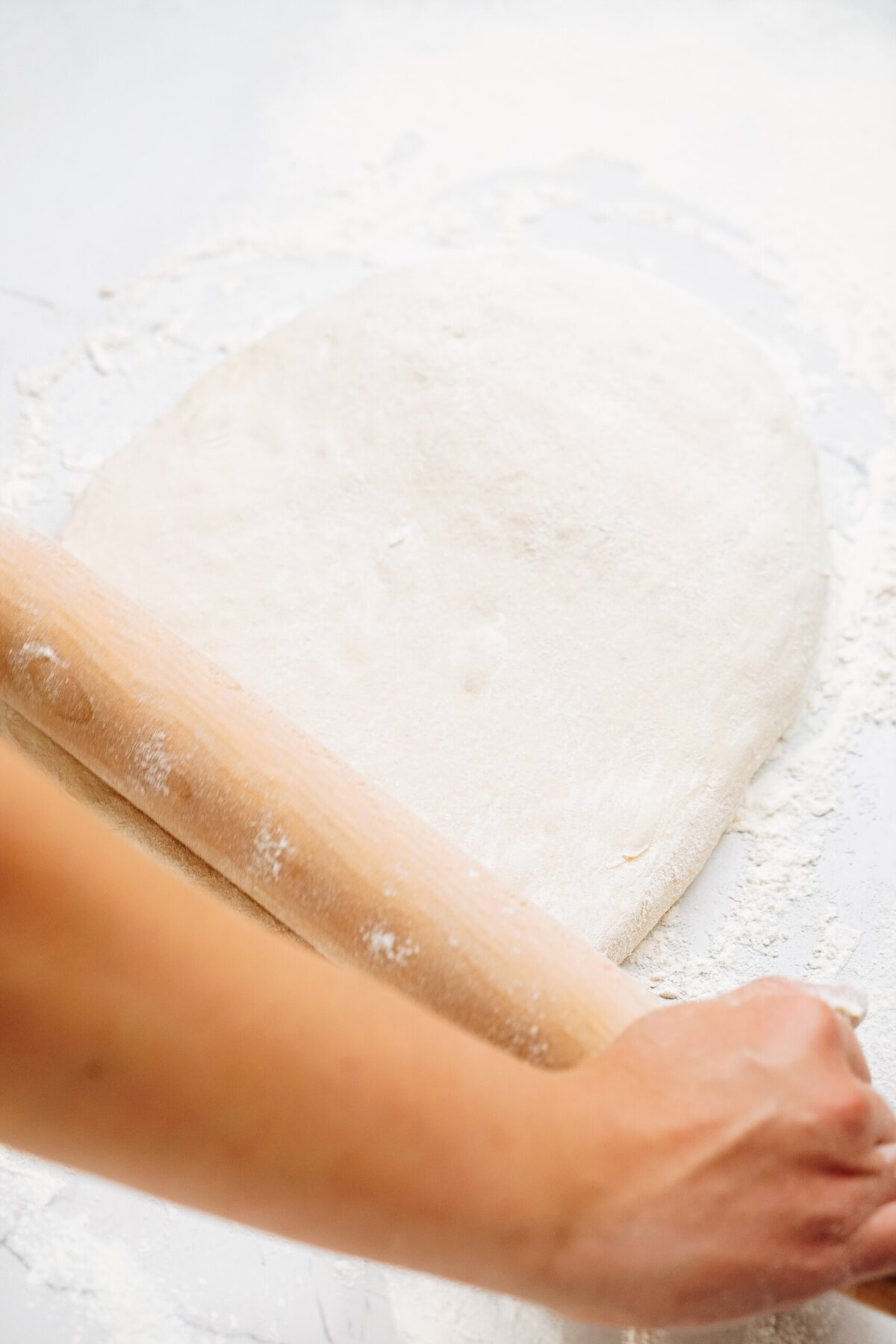Flour a clean surface and dump risen dough onto the board. Sprinkle the dough and rolling pin in more flour and start to roll a 24″x18″ rectangle (approximately). As you roll, be sure to move the dough around to ensure no sticking. Add more flour as needed.