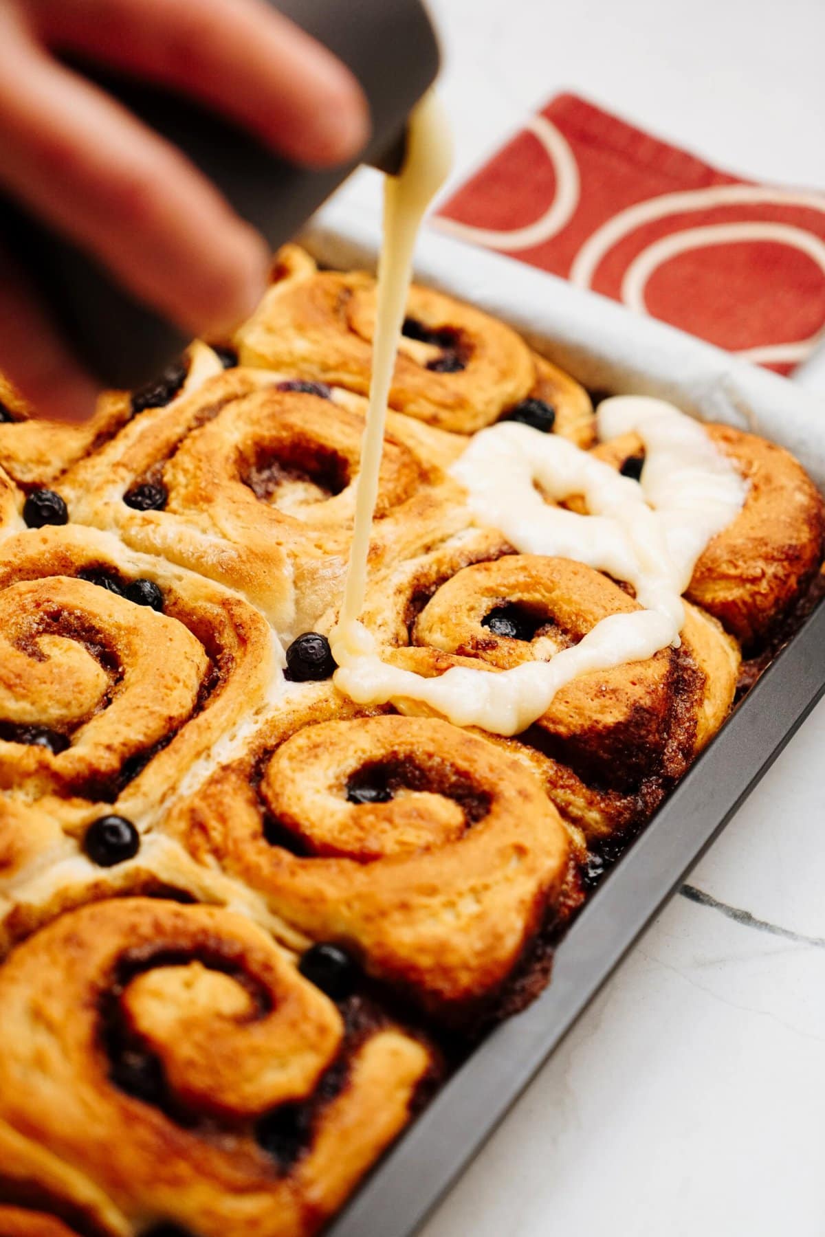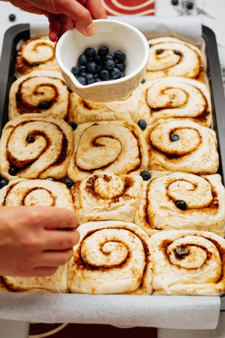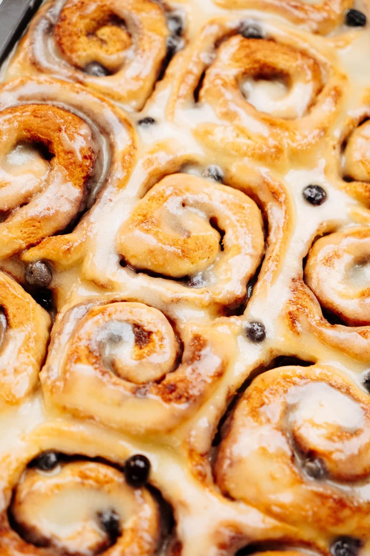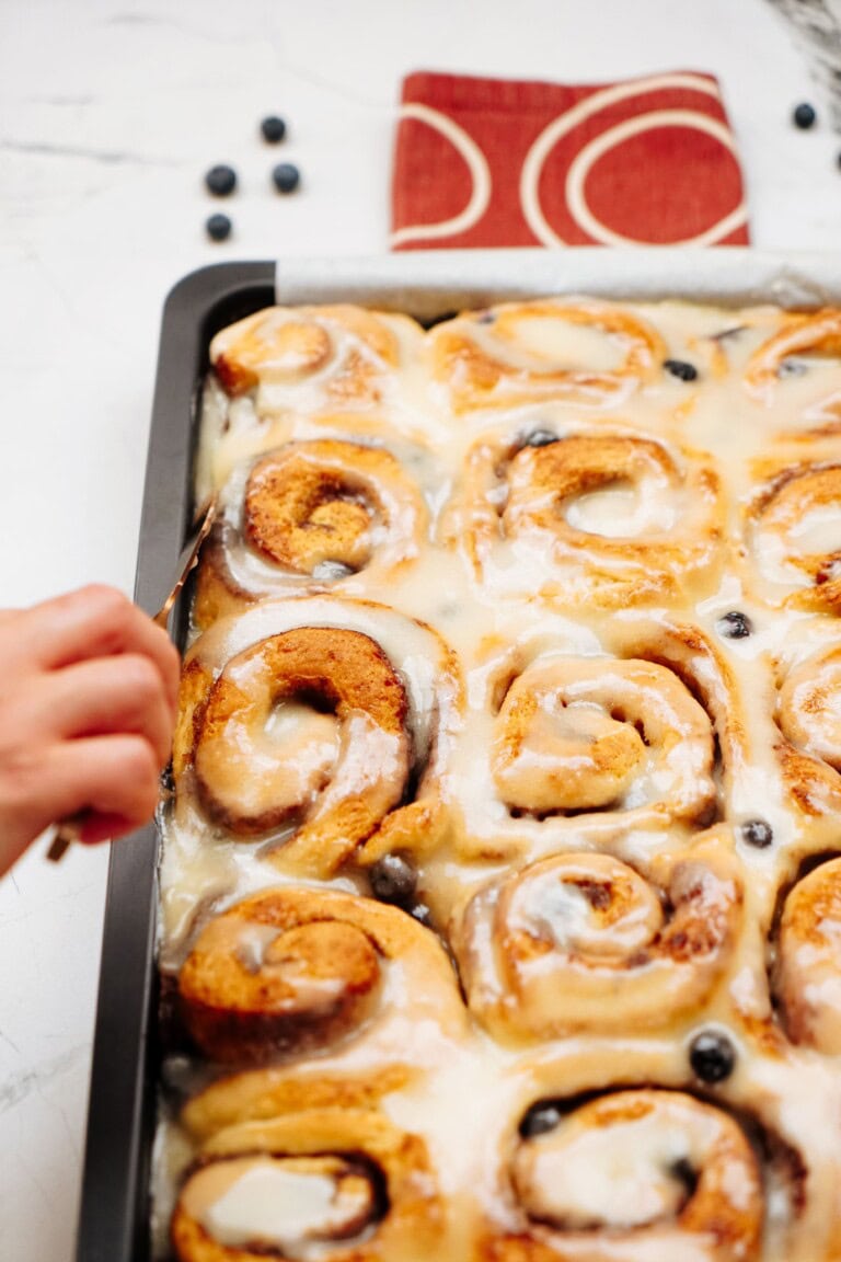 I just took my over the top soft and chewy cinnamon roll recipe and made it even better, by adding blueberries! These made from scratch Blueberry Cinnamon Rolls will be devoured in minutes!