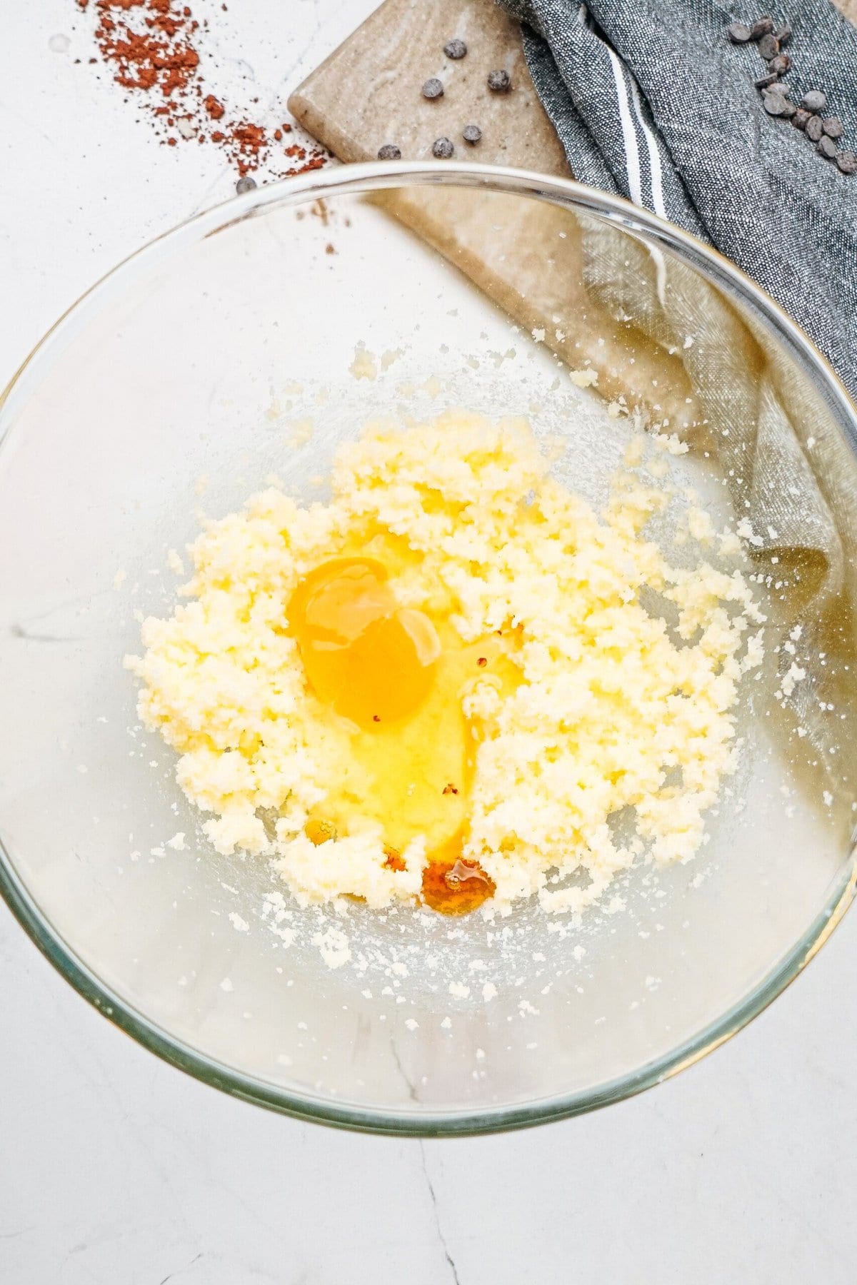 - In a large bowl, using an electric hand mixer, cream butter and sugar. Stir in egg and vanilla extract. Scrape sides and whip until light and fluffy.
