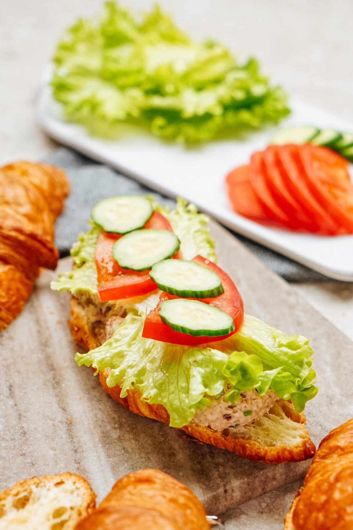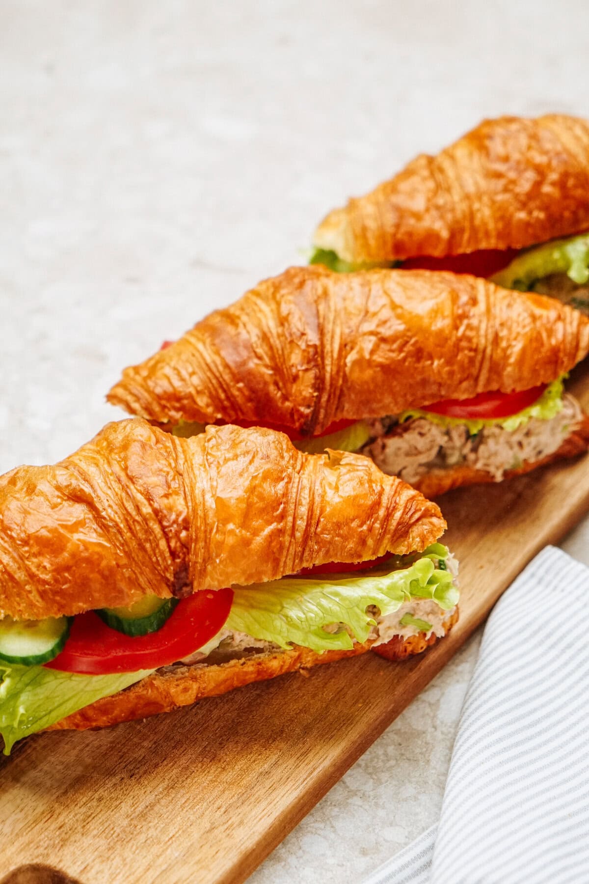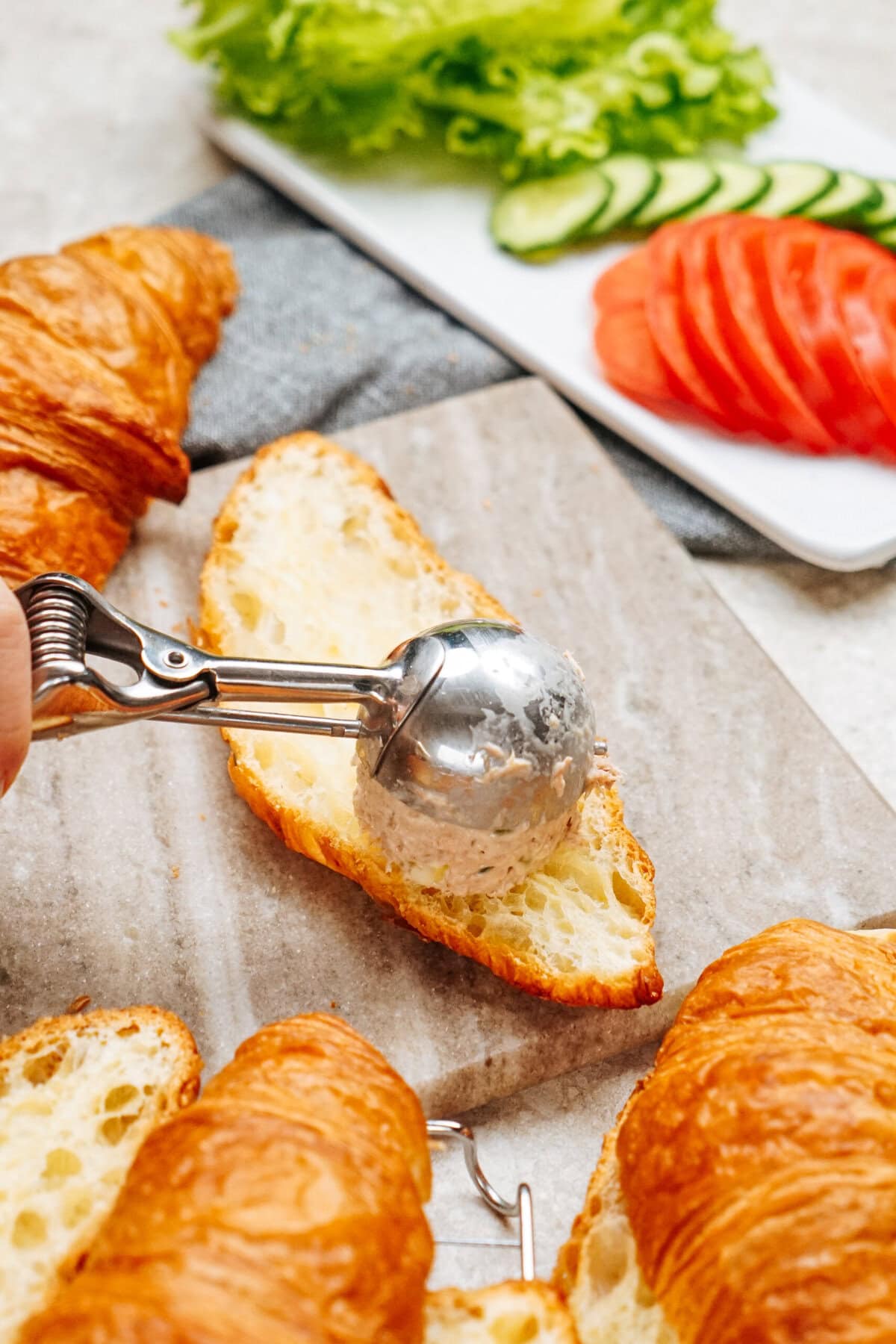 Now take some bread and give it a slice, if needed. You could use regular sandwich bread for this recipe but I love to use croissants. I’d even argue that this is the best bread to use for a tuna salad sandwich. Croissants are buttery, flakey, and hold up well to all the fillings. Buy store-bought or make homemade croissants.