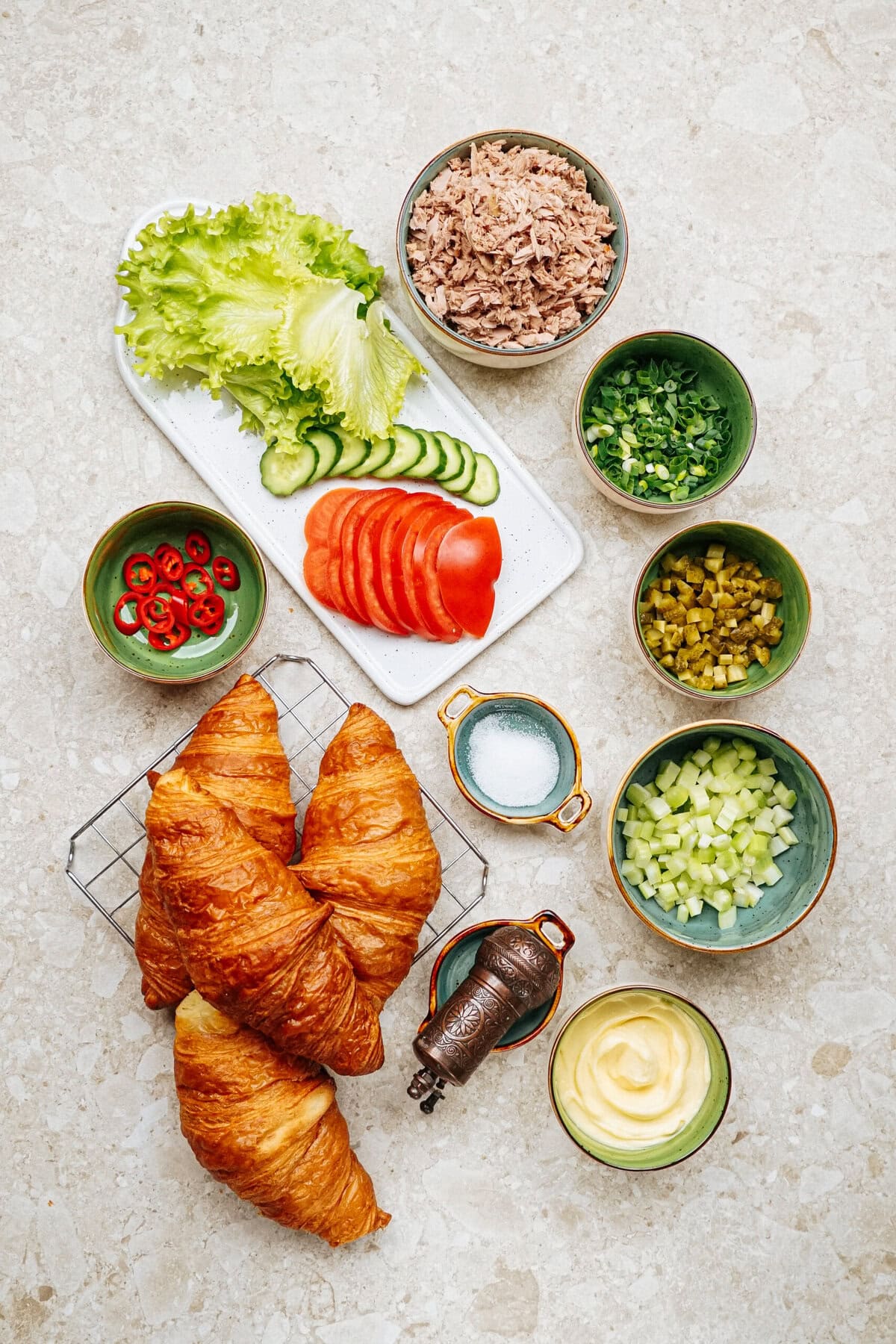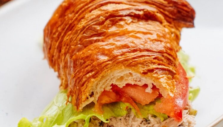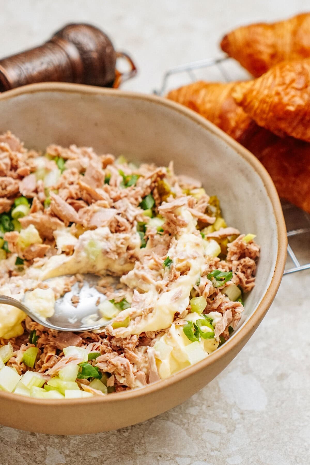 Now take some bread and give it a slice, if needed. You could use regular sandwich bread for this recipe but I love to use croissants. I’d even argue that this is the best bread to use for a tuna salad sandwich. Croissants are buttery, flakey, and hold up well to all the fillings. Buy store-bought or make homemade croissants.