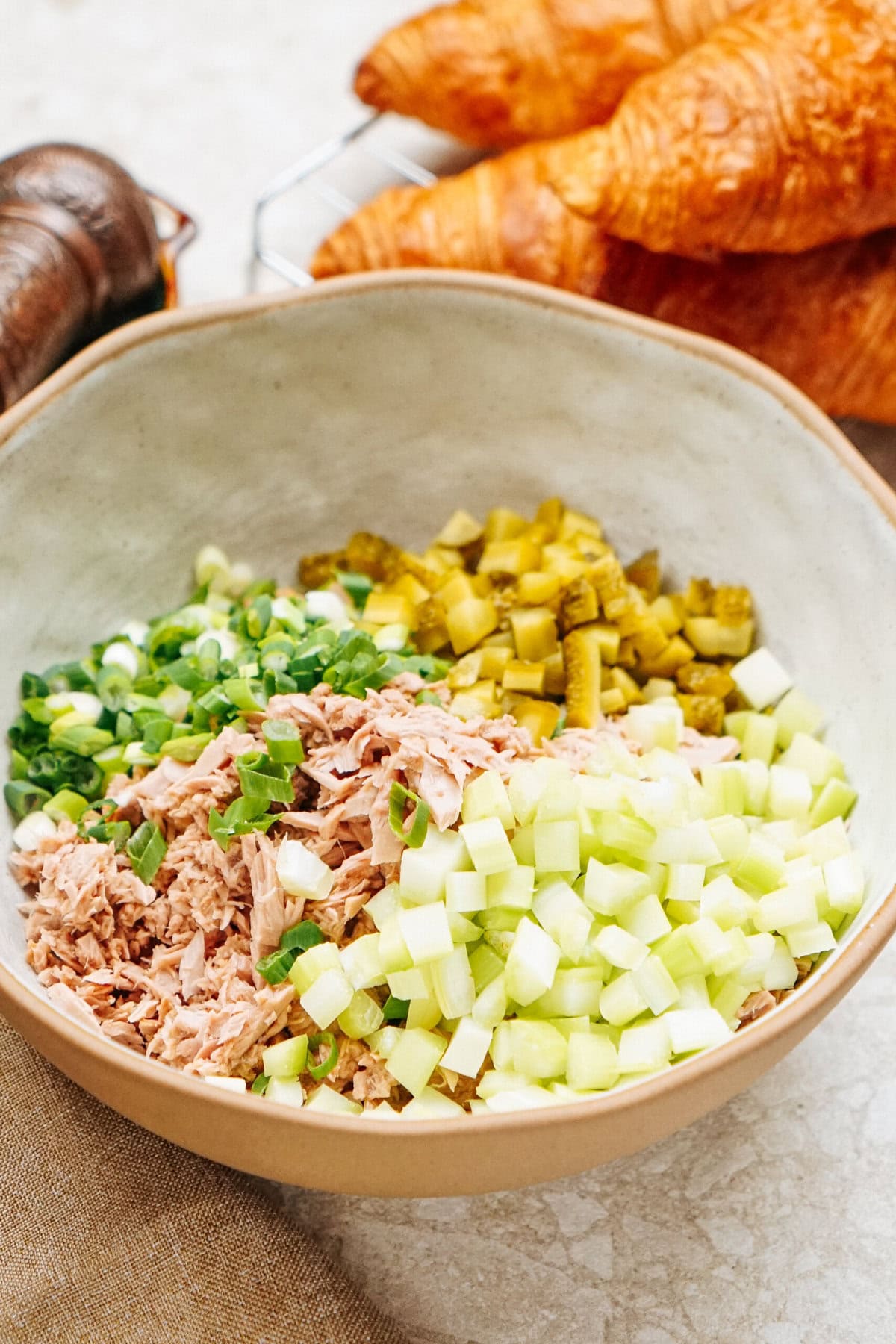 I add in a lot of crunchy, vinegary ingredients because I love the bite vinegar gives, but you are welcome to adjust this tuna salad sandwich as you’d like! This is just a starting point; make it, taste, and adjust the ingredients as you like.