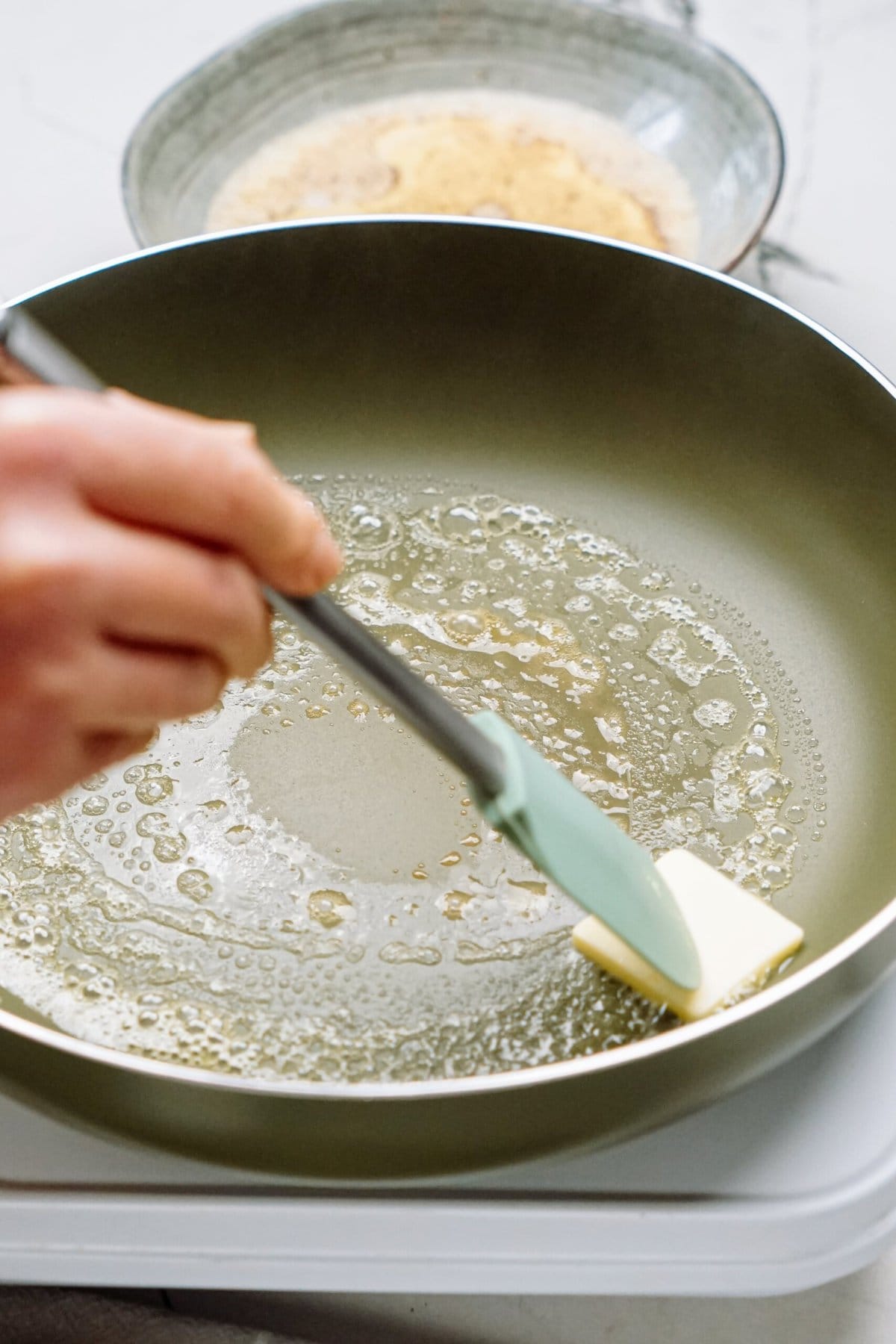 - Preheat a large, nonstick skillet over medium heat. Melt in 1 tablespoon butter in the bottom of the pan.