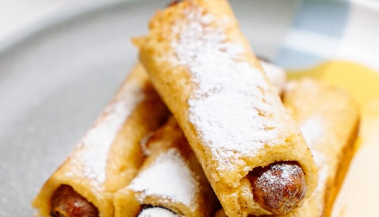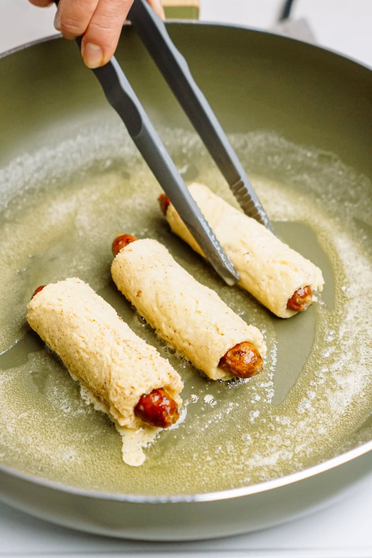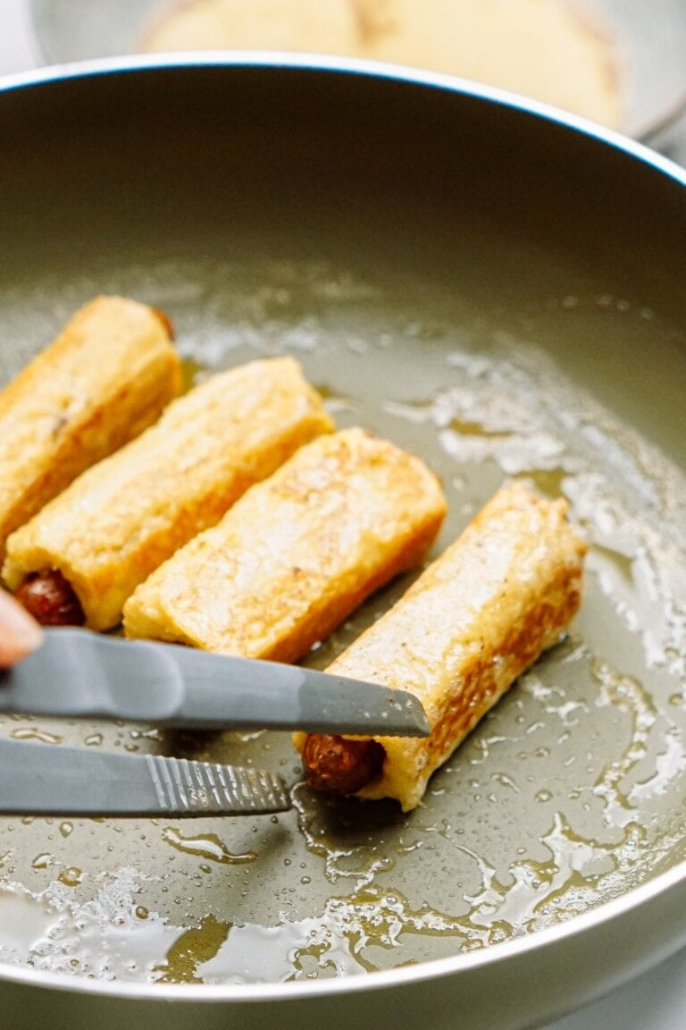 - Dip eight bread wrapped breakfast sausages into the egg mixture and place each one into the hot butter, being careful not to overcrowd the pan. Cook and rotate the pigs to create golden blankets on every side.