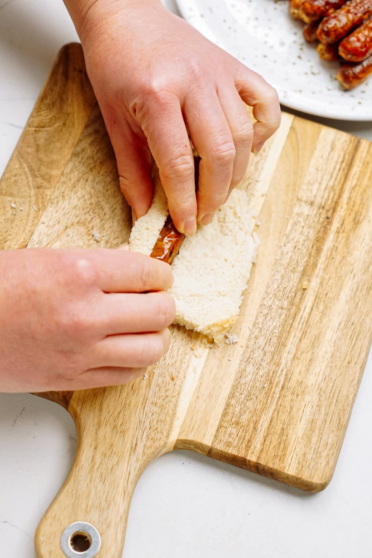 Remove sixteen middle slices of white bread from the loaf. Cut the crusts off and discard (or use as breadcrumbs for another recipe).Wrap one cooked breakfast sausage up in one piece of bread, pressing the bottom edge of the bread on the board to seal tightly around the sausage. Repeat with remaining sausages.
