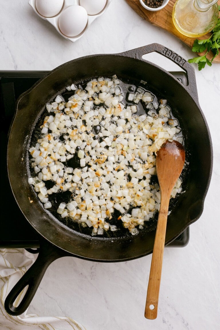 - Add diced onions and slowly cook until they begin to caramelize, about 10 minutes.