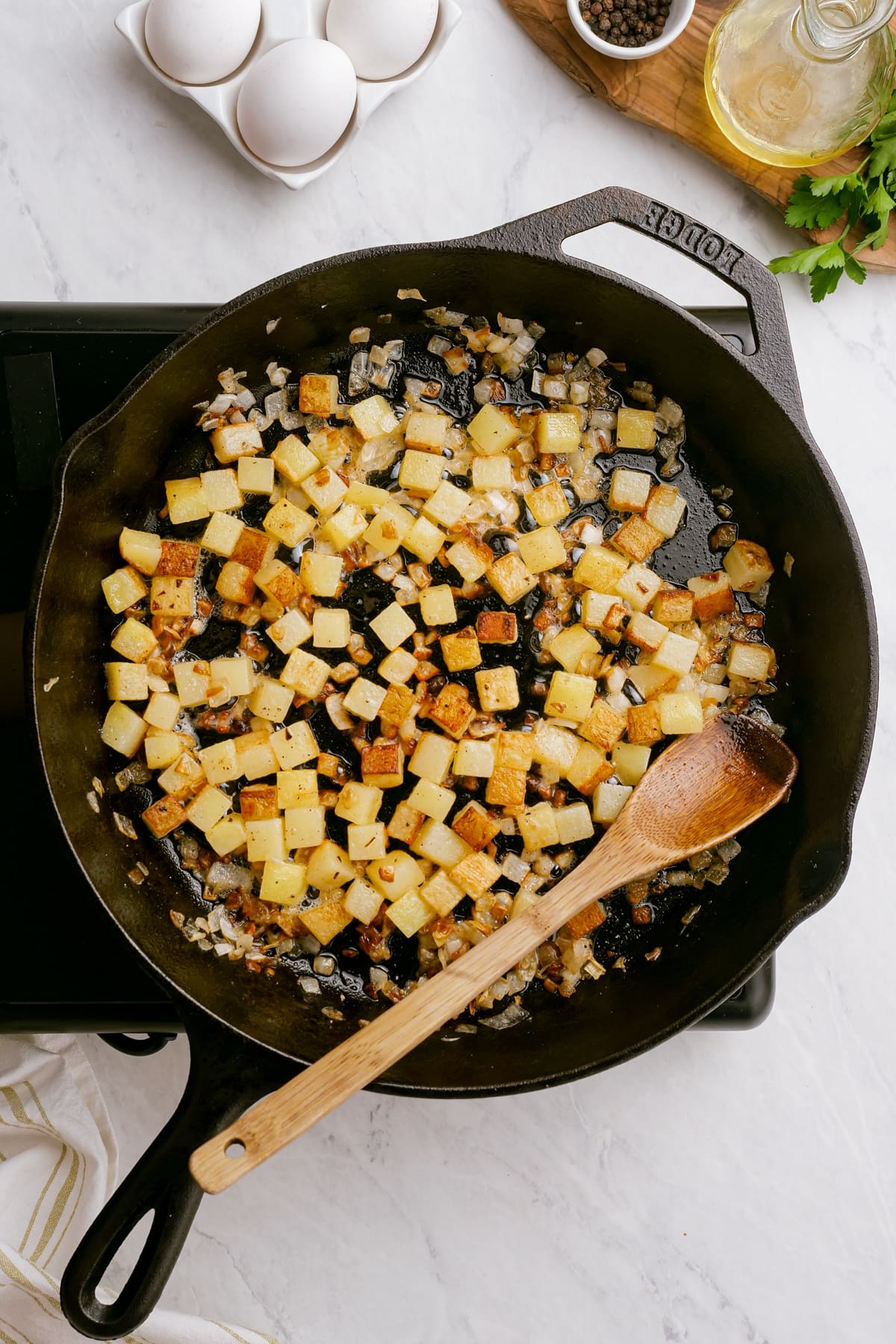 Next, stir in potatoes and cook until potatoes are golden brown, stirring and flipping occasionally. Season with salt and pepper, and garnish with fresh herbs like parsley.
