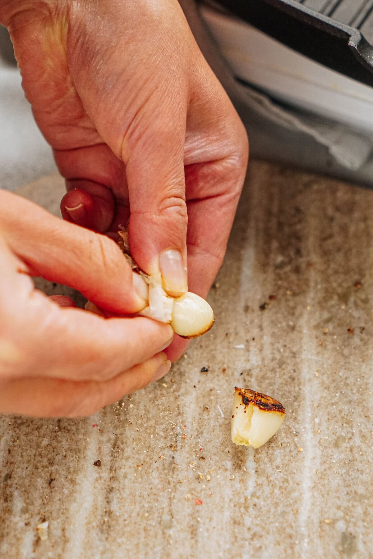 - Remove garlic from grill when it has sufficient grill marks and has somewhat softened. Squeeze out 4 cloves and set aside for dressing.