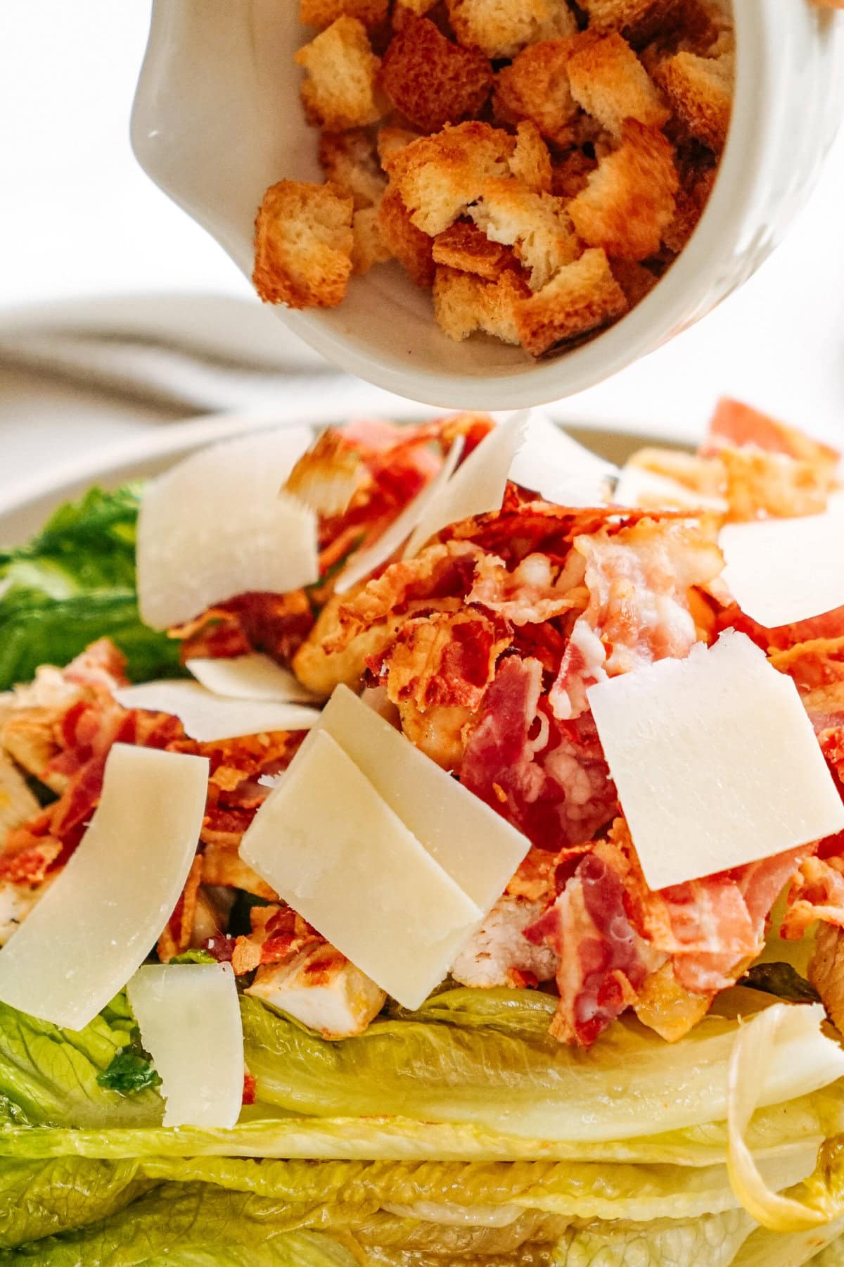 - Separate the romaine leaves (optional) and place them on a large serving platter. Add grilled chicken, bacon, parmesan cheese shavings, crushed croutons, and drizzle with the caesar dressing. Season with more freshly cracked black pepper, if desired. Serve immediately and enjoy!