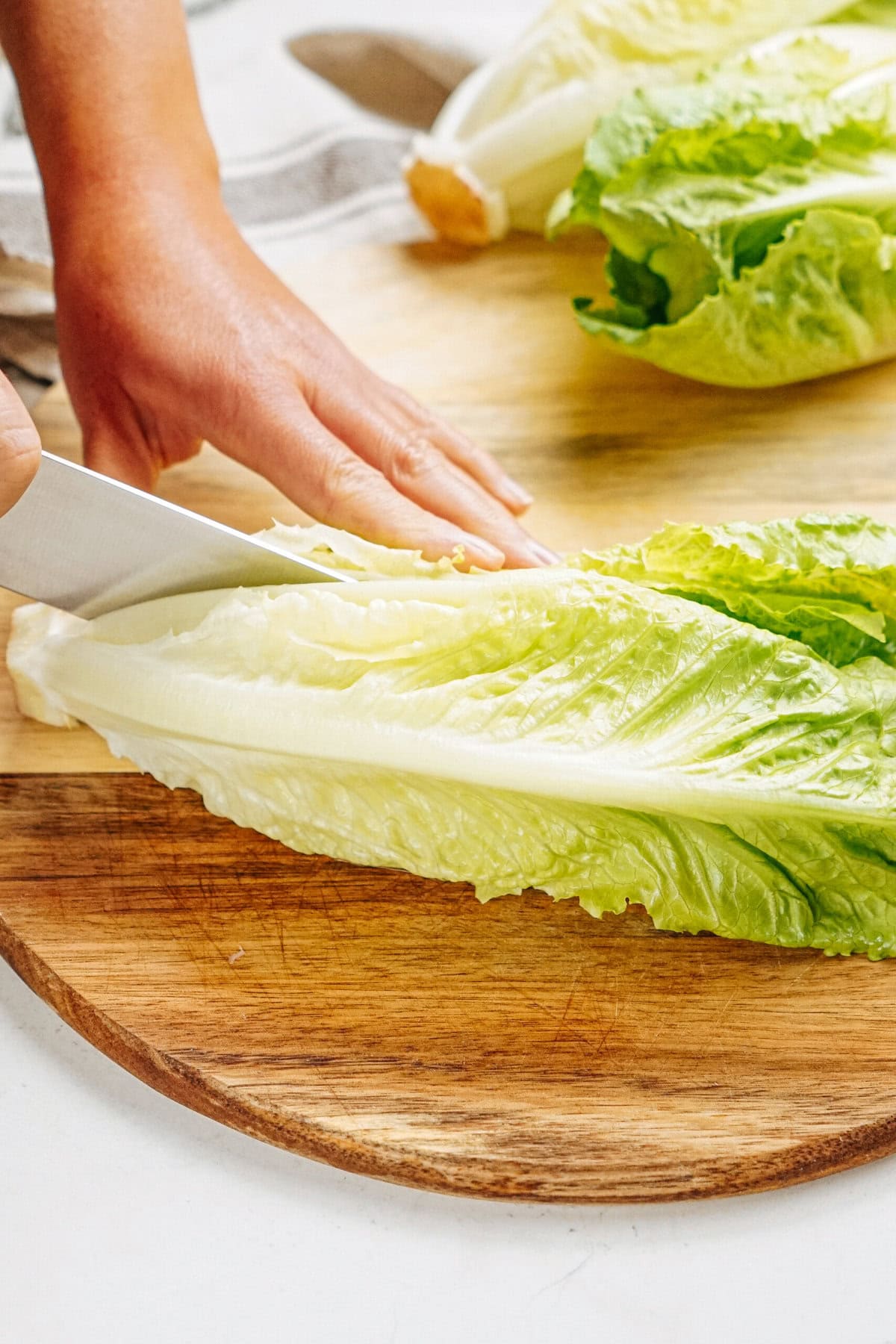 Preheat indoor or outdoor grill to high. The idea is to char the lettuce as quickly as possible to reduce the wilting. Cooked, wilted lettuce is gross, but a quick grill to get that smoky flavor and grill marks is delicious!