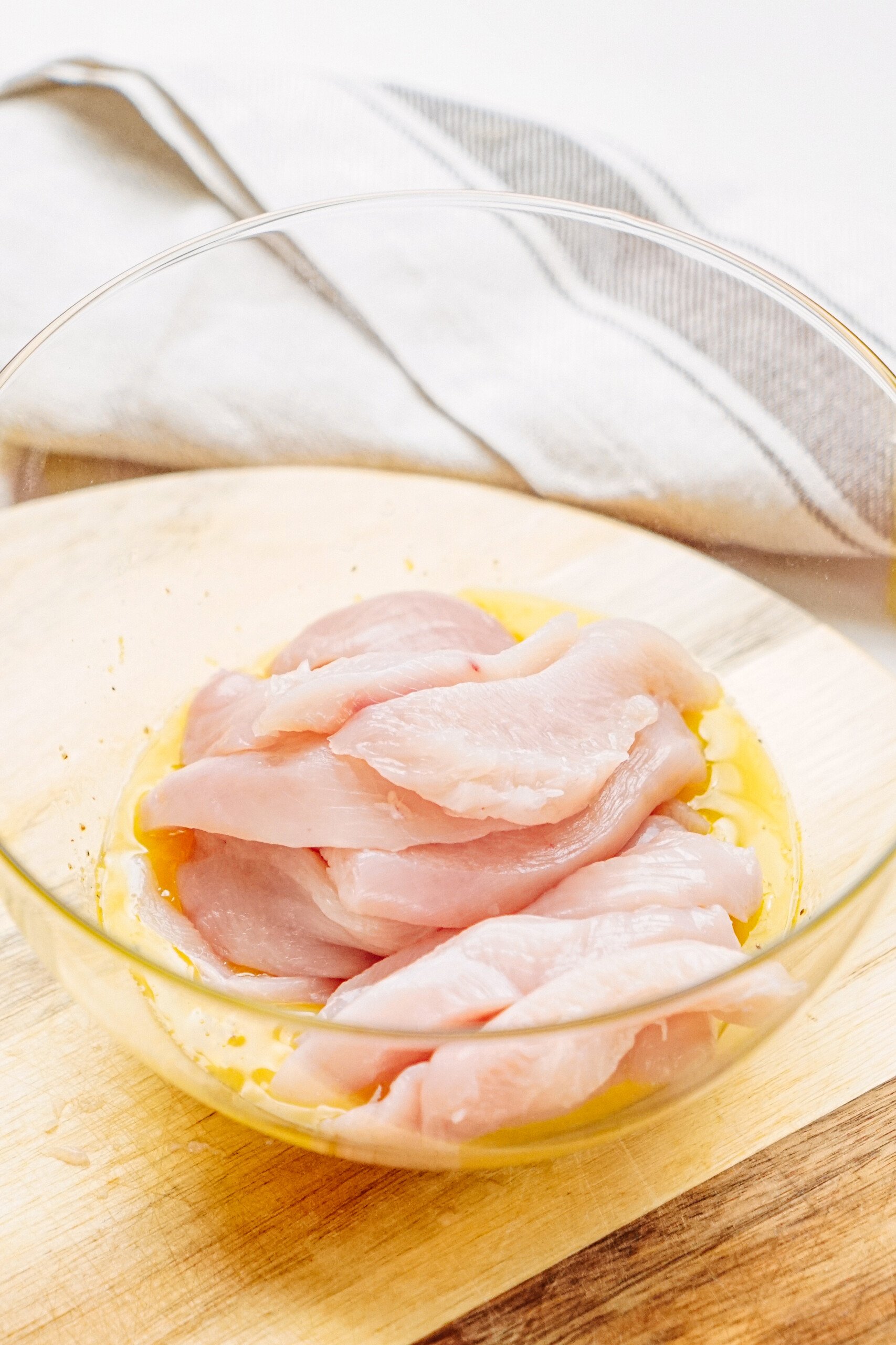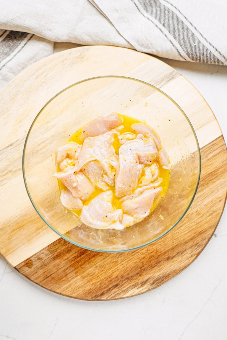 - Trim chicken breasts of any excess fat and cut into thin strips. Place in bowl with marinade ingredients and set aside while preparing other recipe elements.