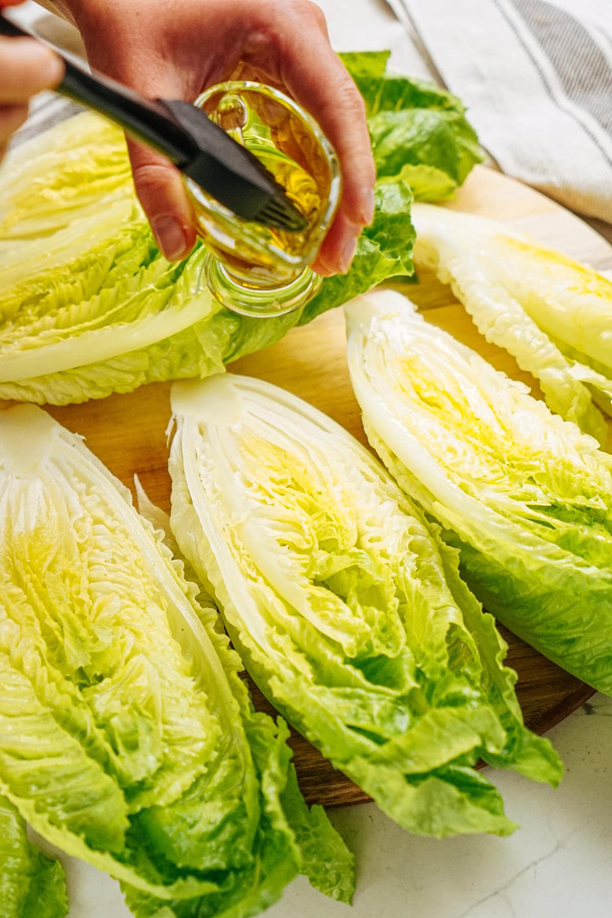 - Slice 3 hearts of romaine in half lengthwise, brush with some olive oil, season with a little salt, and set aside.