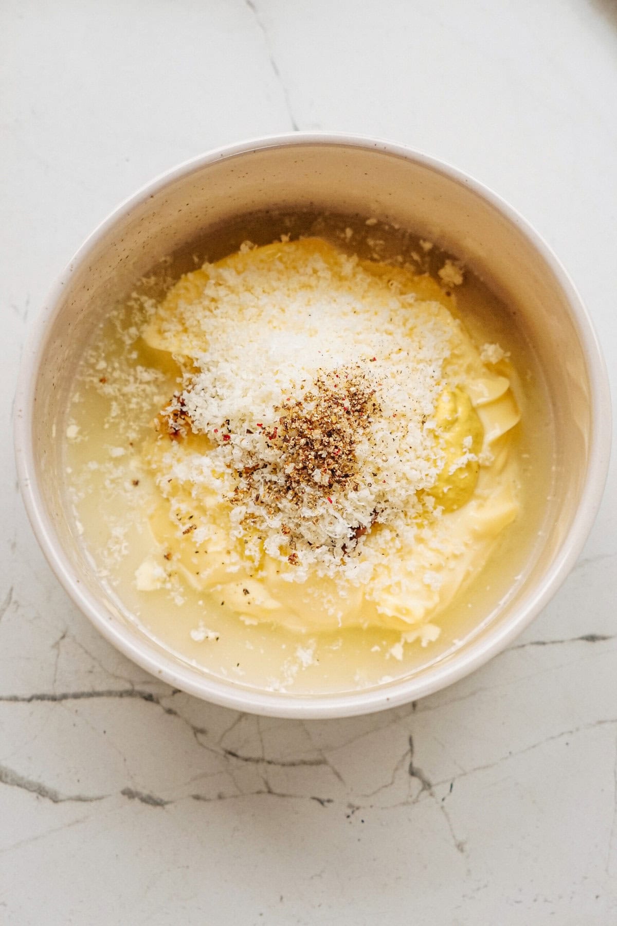 Add all dressing ingredients (mayonnaise, mustard, garlic, parmesan cheese, anchovies, pepper, and lemon juice) to a small blender and blend until smooth. (You can also whisk all ingredients in a small bowl if you don’t have a blender.)