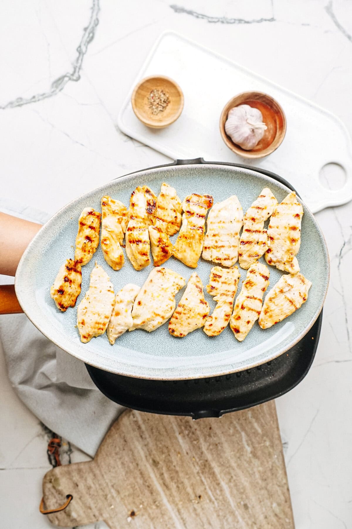 The beauty of this recipe is that you can use either an outdoor or indoor grill to make it! So if you’ve packed away your grill for the winter you can still make this dish year-round. A cast iron grill pan also works just as well and worst case scenario, you can brown the chicken in a nonstick skillet with a little nonstick cooking spray. It won’t have that smoky flavor you get from a grill, but it’s still really flavorful.