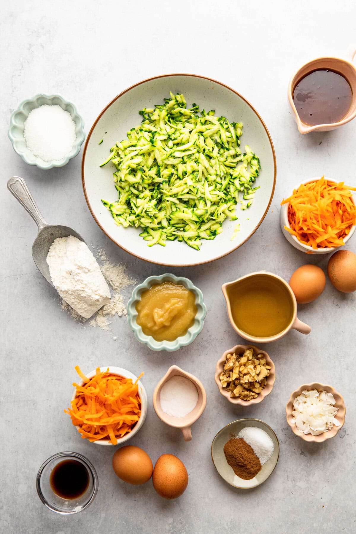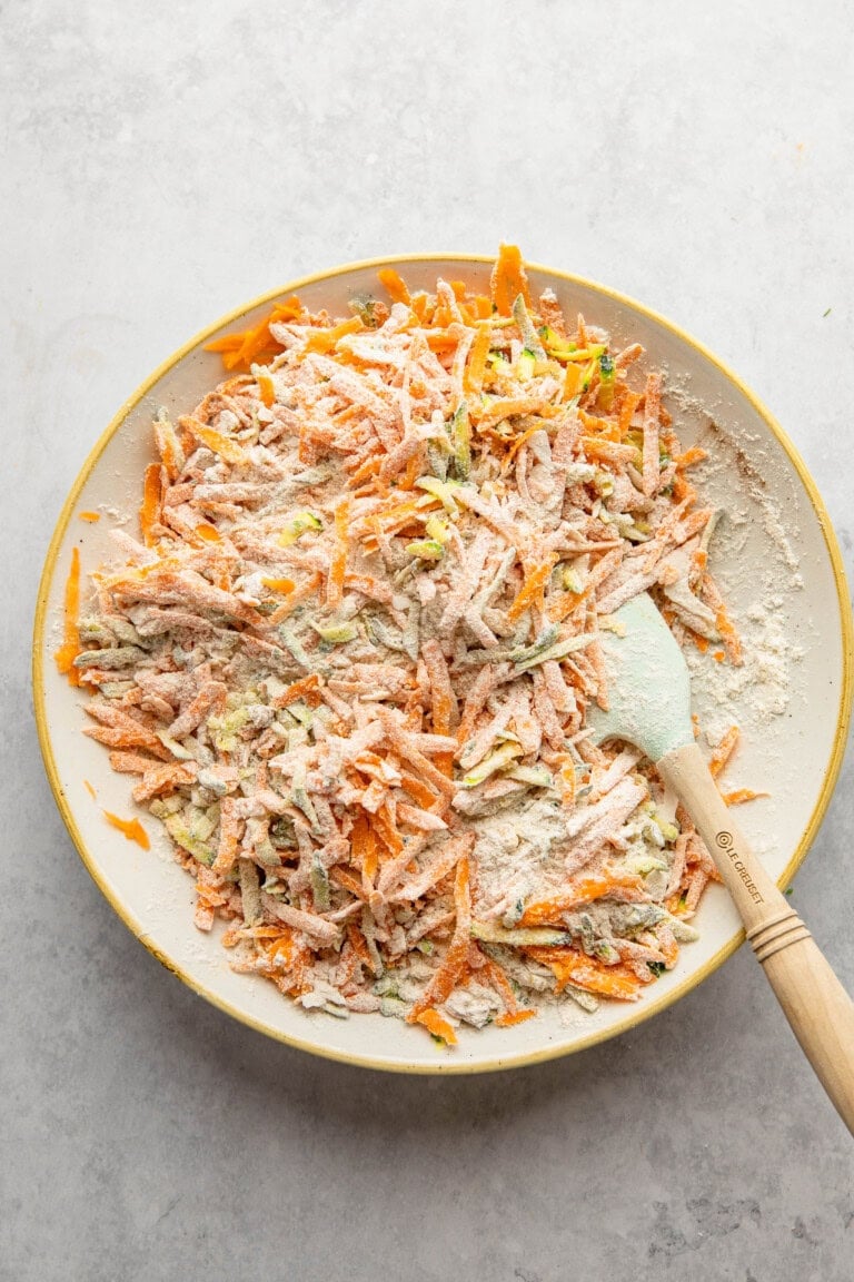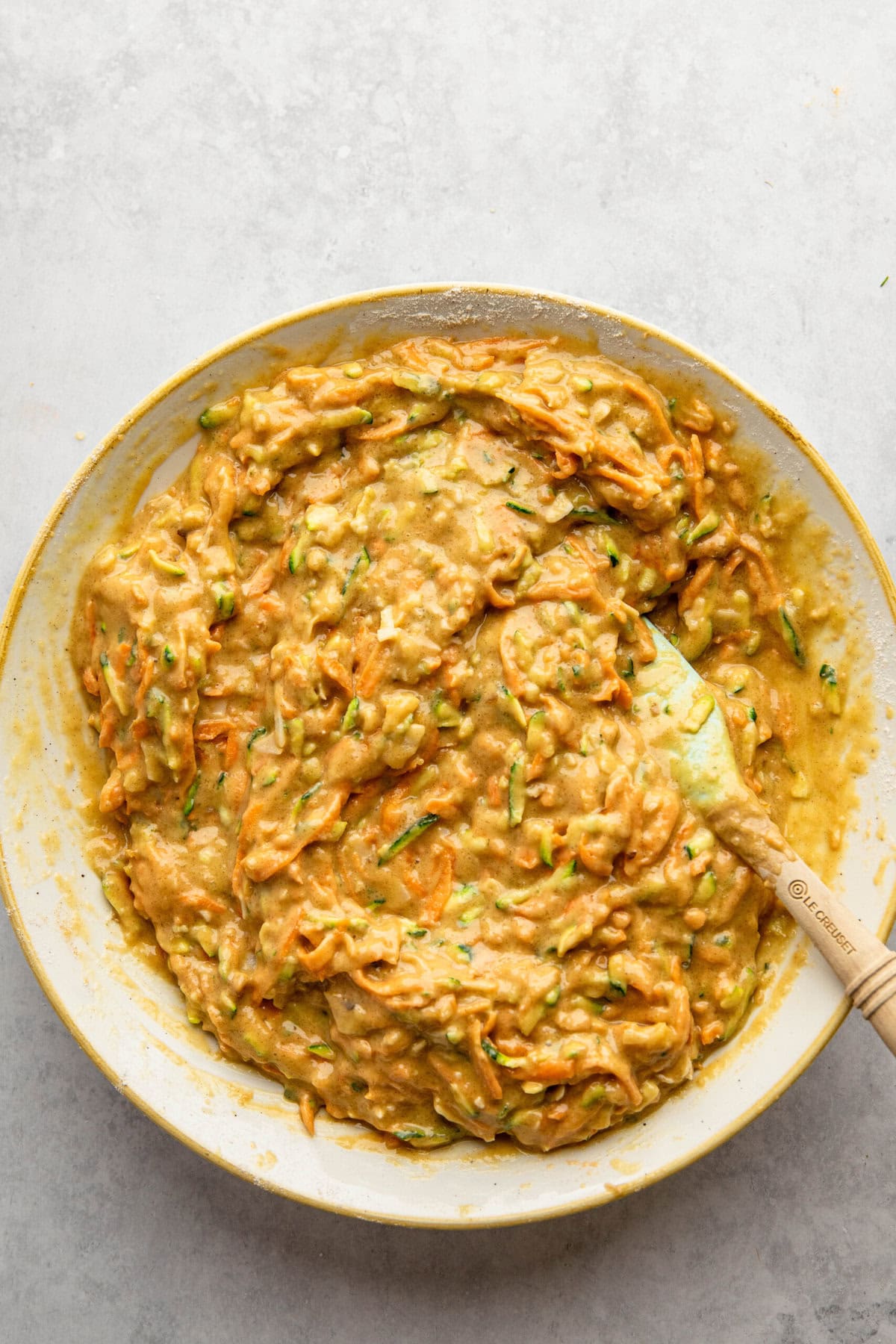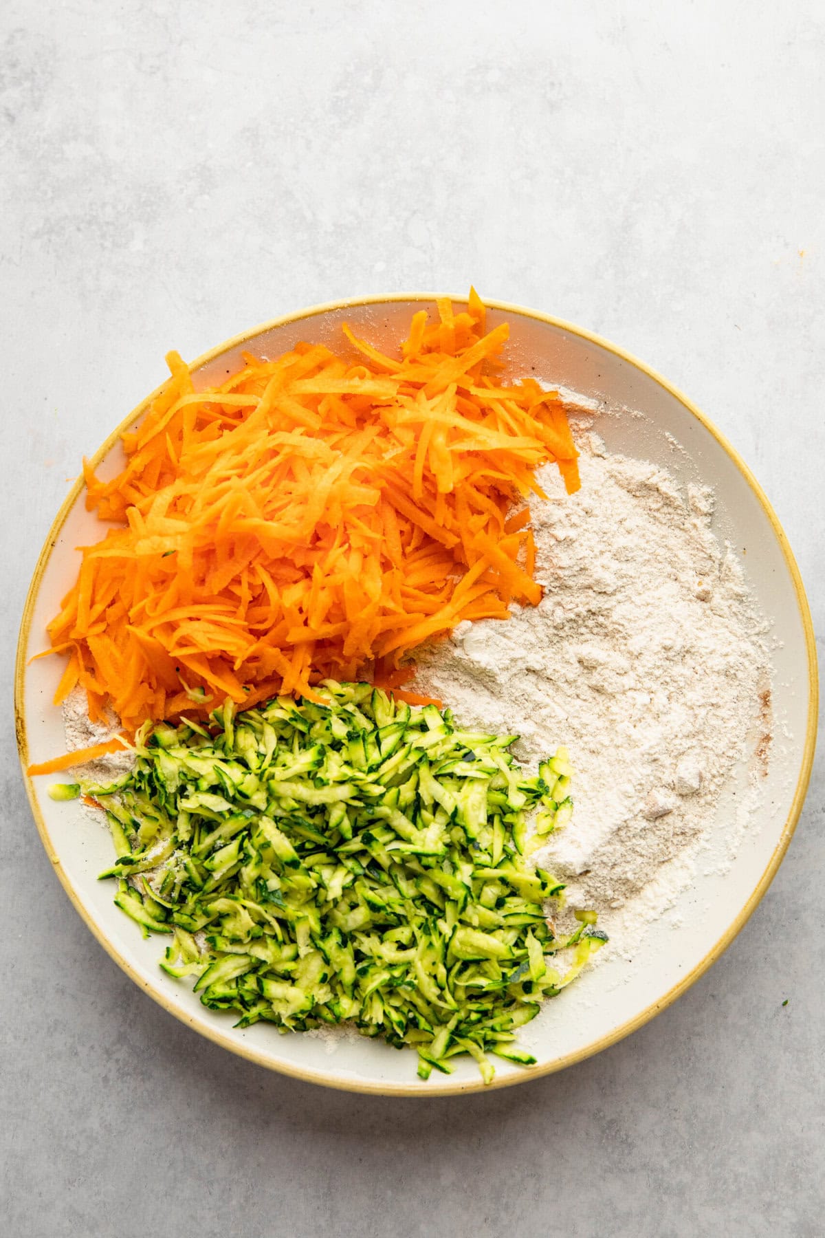 • zucchini + carrot– use a box grater to shred. Be sure to remove as much moisture as possible from the shredded zucchini. I use a tea towel to do this.