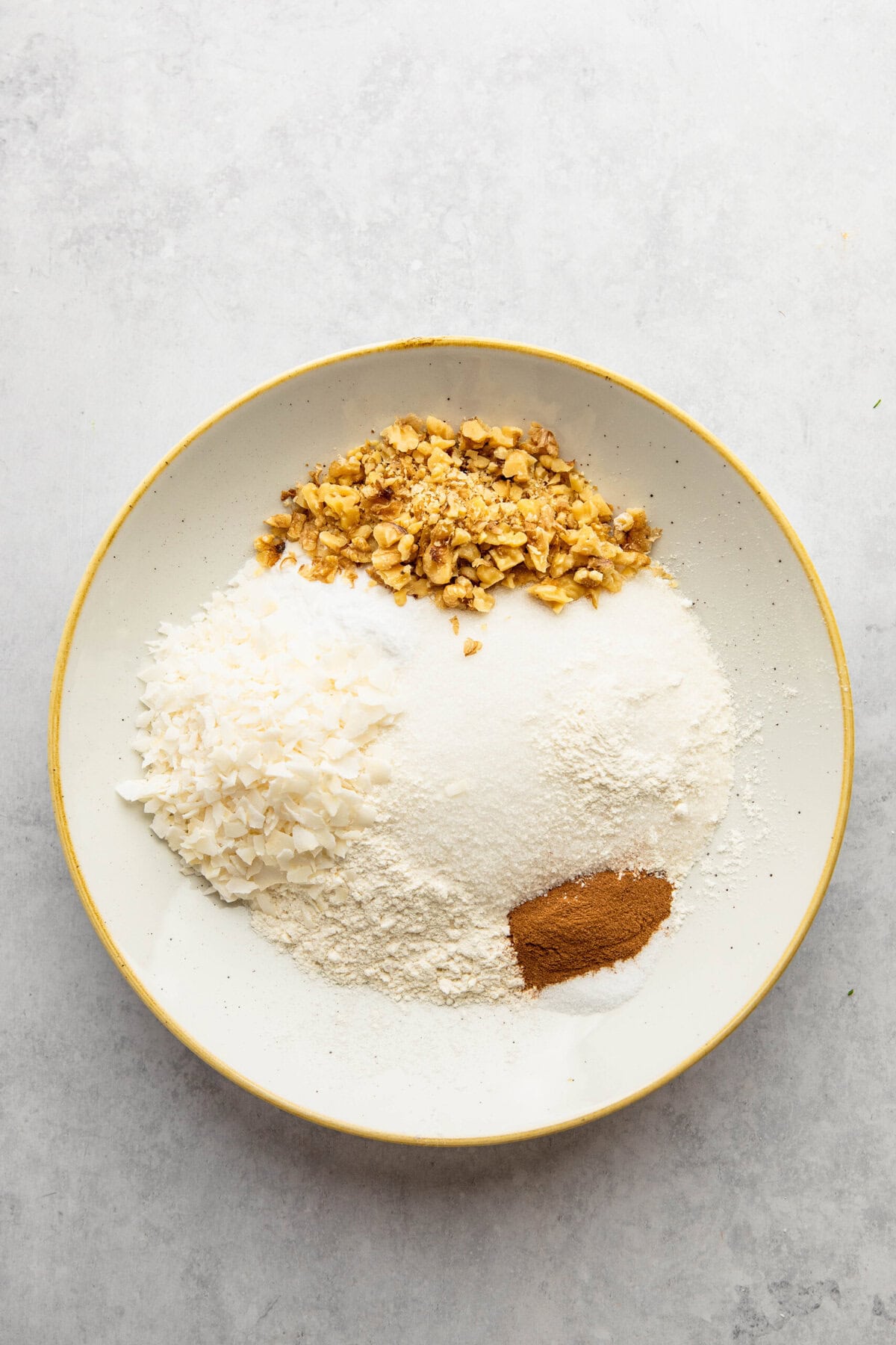 • In a large bowl, whisk sugar, flour, cinnamon, baking soda, salt, coconut and walnuts until combined. Add in zucchini and carrot and stir.