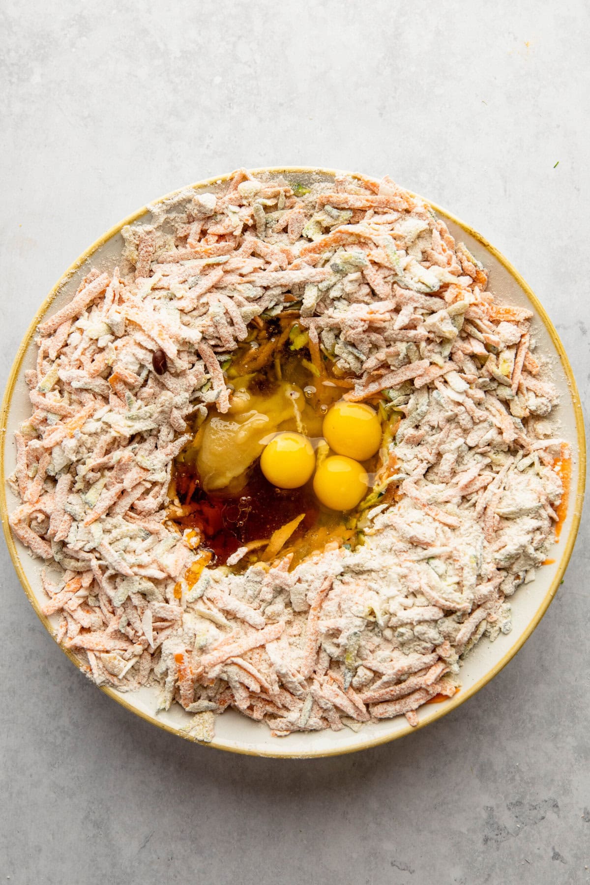 In a large bowl, whisk the dry ingredients (sugar, flour, cinnamon, baking soda, salt, coconut and walnuts together until combined. Add in the grated zucchini and carrot.