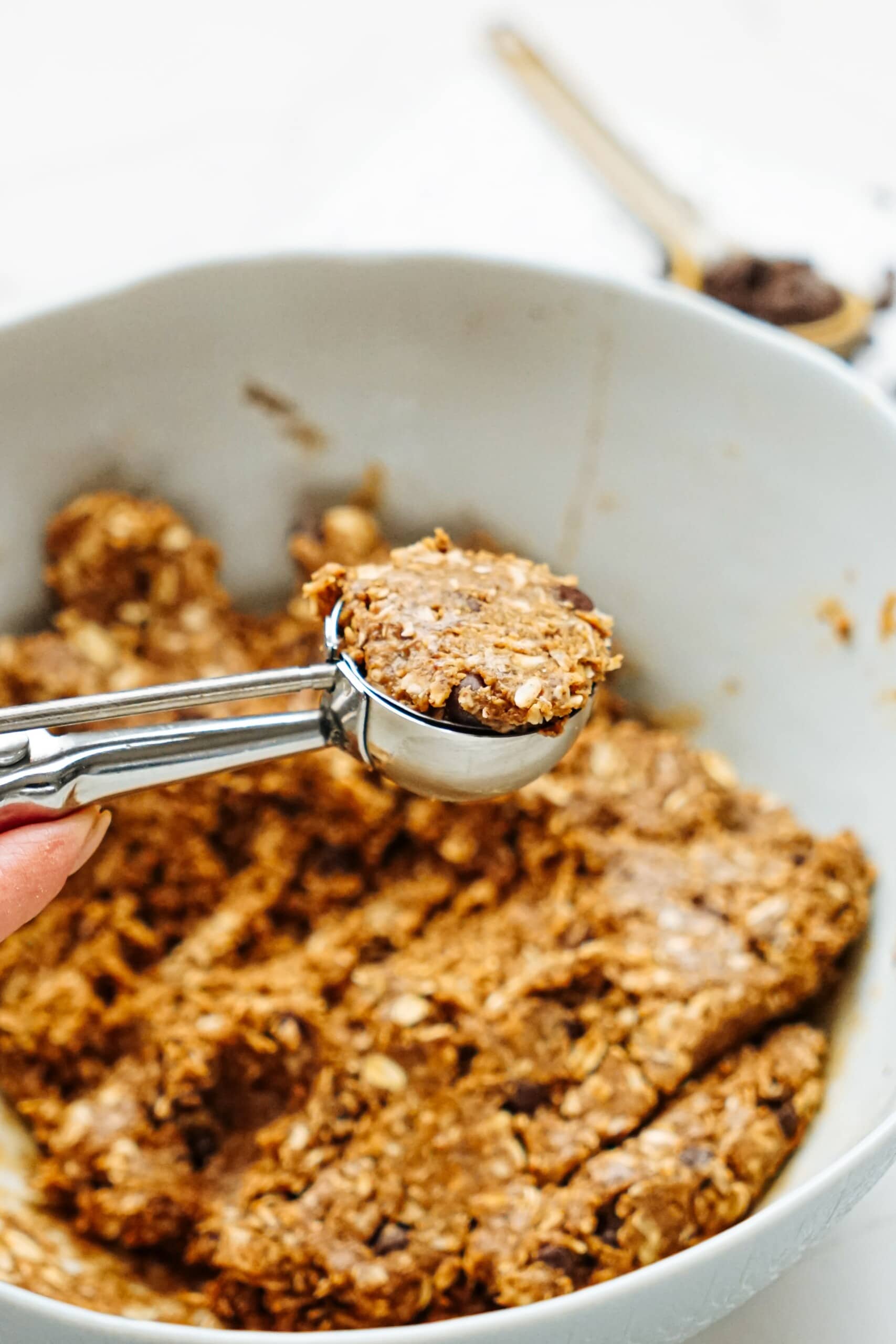 - Place all ingredients into a large bowl and stir with a rubber spatula until all ingredients are moist and sticky. Using a small cookie scoop, portion out energy bites into even balls.