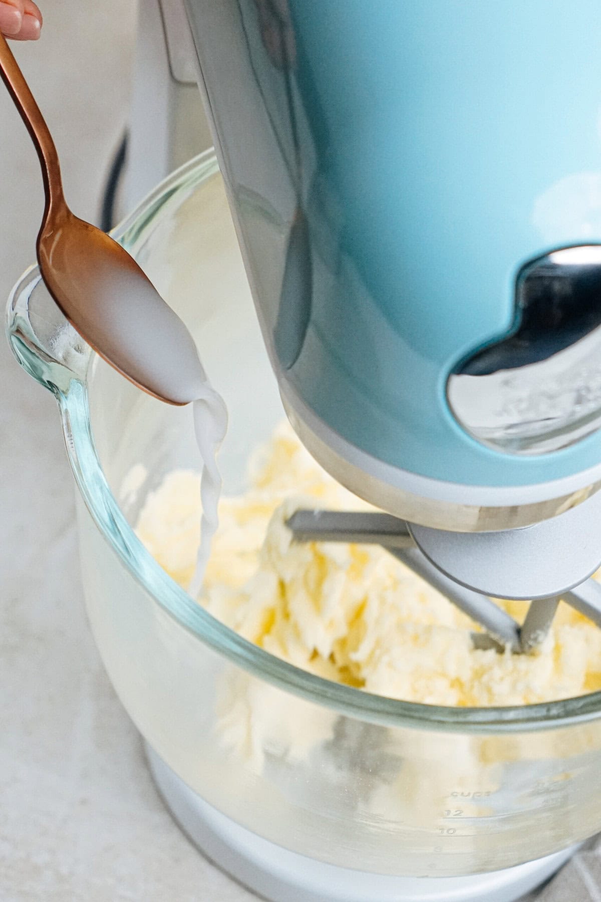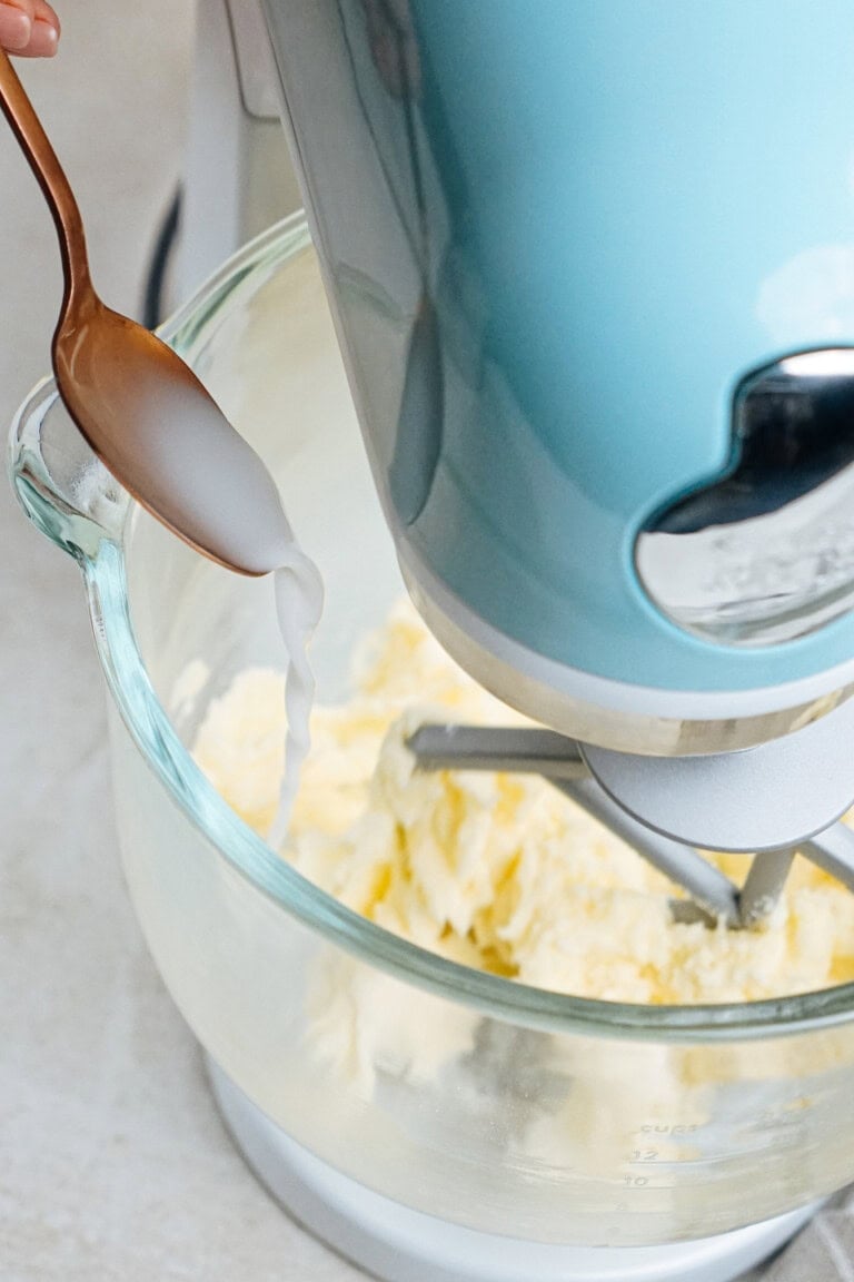 • With the mixer on, slowly stream in your milk tablespoon by tablespoon until it starts to come together and look creamy.