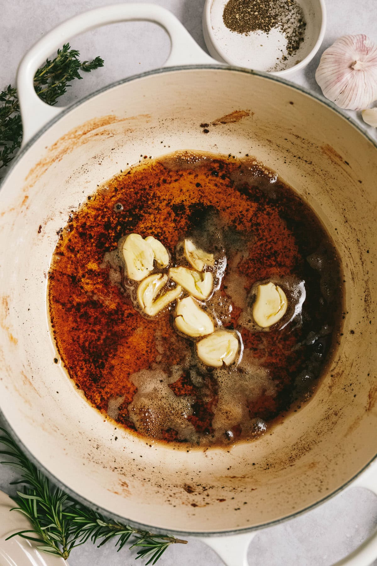 - Turn heat down to a low heat and add smashed garlic. Cook for 1-2 minutes, being careful not to burn.