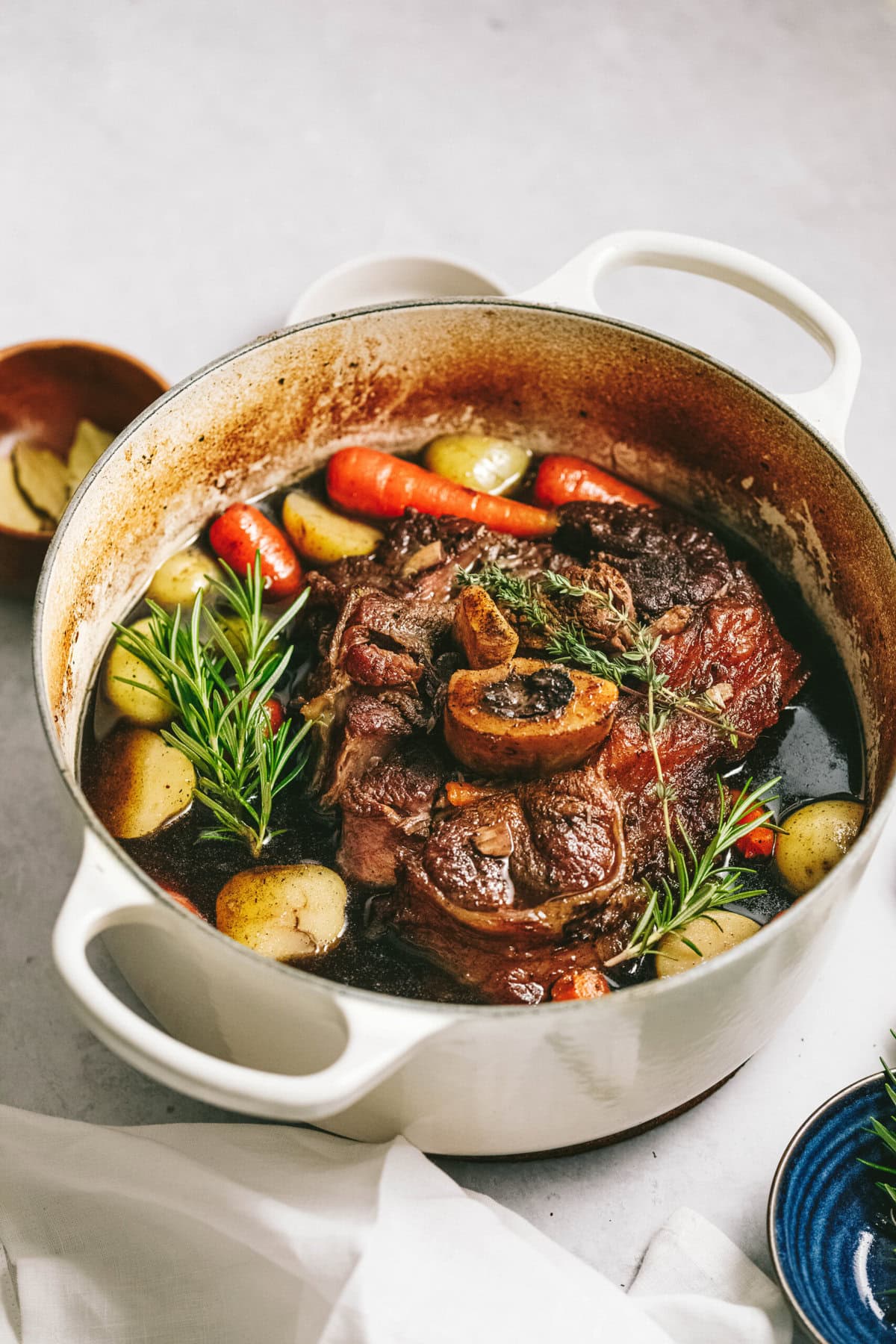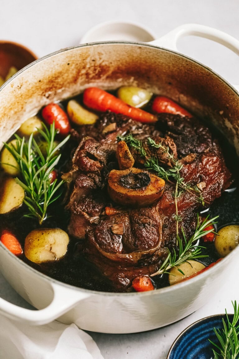 Place lid on pot and bake in the oven for 3-3 1/2 hours or until meat is fall-apart tender. Cook times may vary slightly depending on your oven.