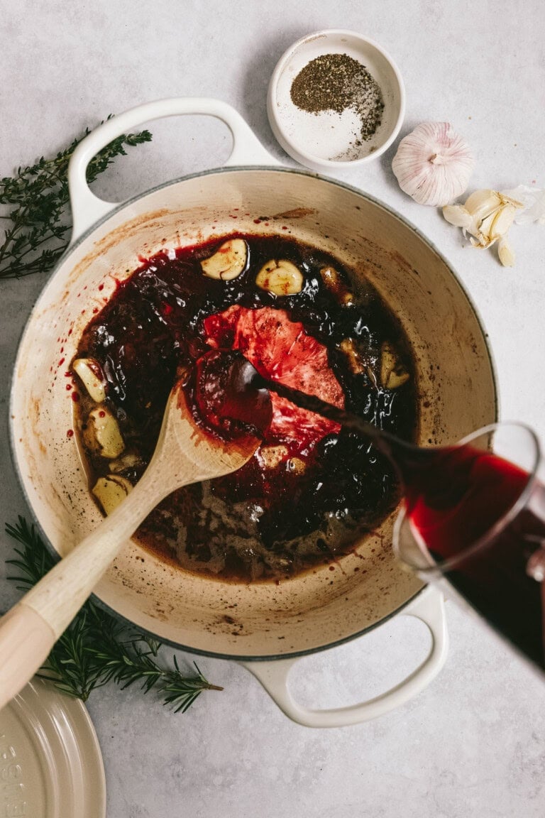 - Turn heat OFF and add red wine, scraping all the good brown bits from bottom of pot with a wooden spoon. Turn heat back on to a medium high heat and let wine reduce for 1-2 minutes.