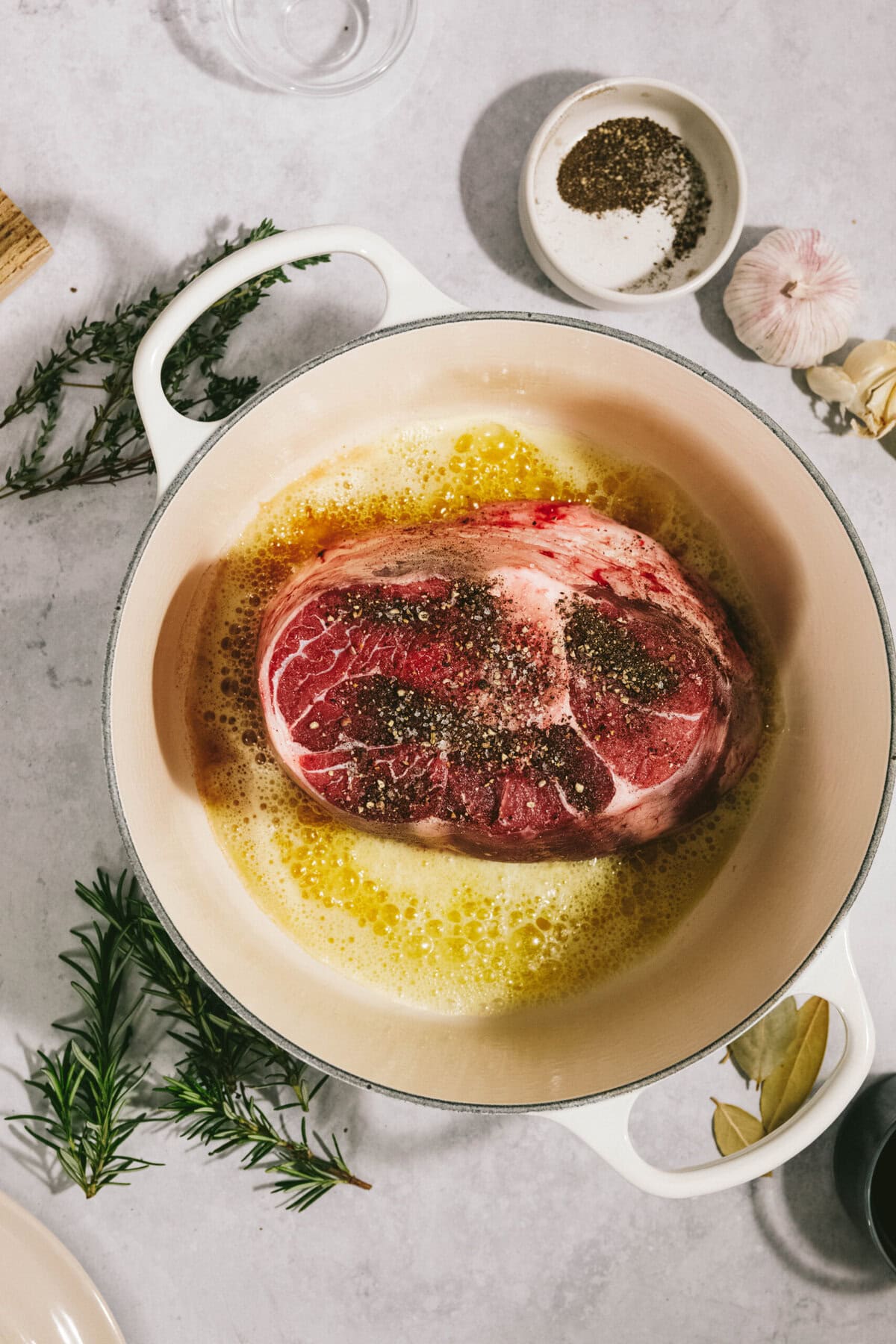 - Liberally salt and pepper arm roast. Add olive oil and butter to pot. Then add the arm roast, searing on both sides (about 4 minutes each side). Remove.