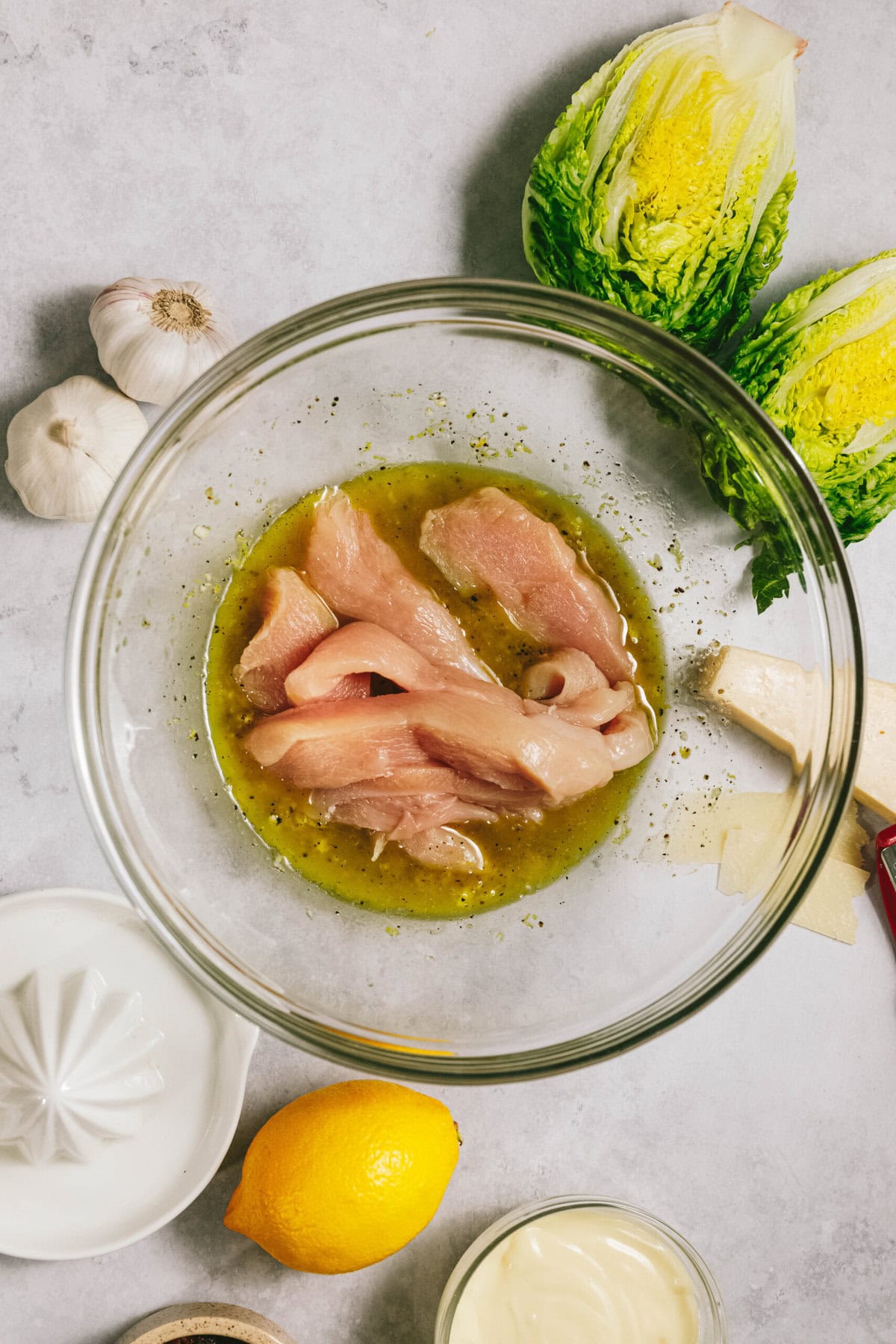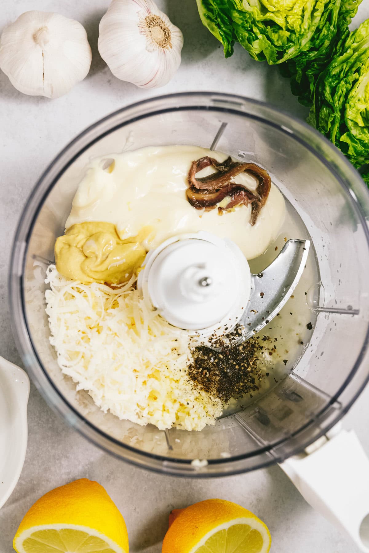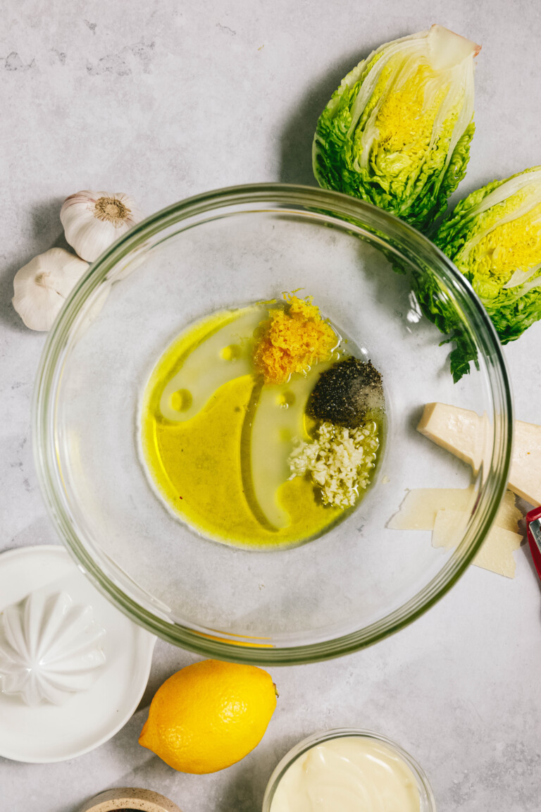 - For the dressing – Mayo, Dijon mustard, lemon juice, anchovy paste (optional but recommended), parmesan, garlic, and black pepper.