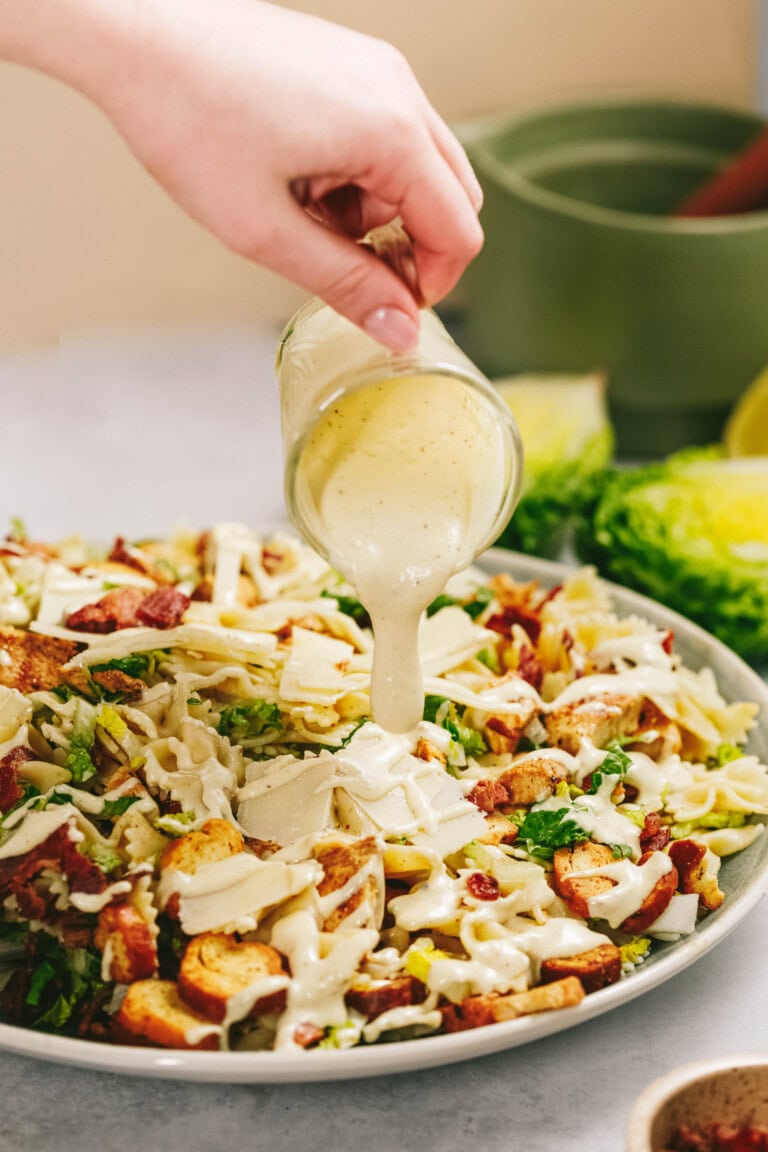 *You can skip the marinating and grilling of the chicken if you have precooked chicken on hand, either from leftovers, meal prep, or a store-bought rotisserie chicken. **If you are allergic to anchovies, you can leave these out of the recipe, but be sure to add salt (to taste). Anchovies have a high salt content, which is why I left salt out of the dressing ingredients. If you think you won’t like the taste, don’t worry – you can’t even tell they’re in there. They just give this dressing the essential umami, salty flavoring.