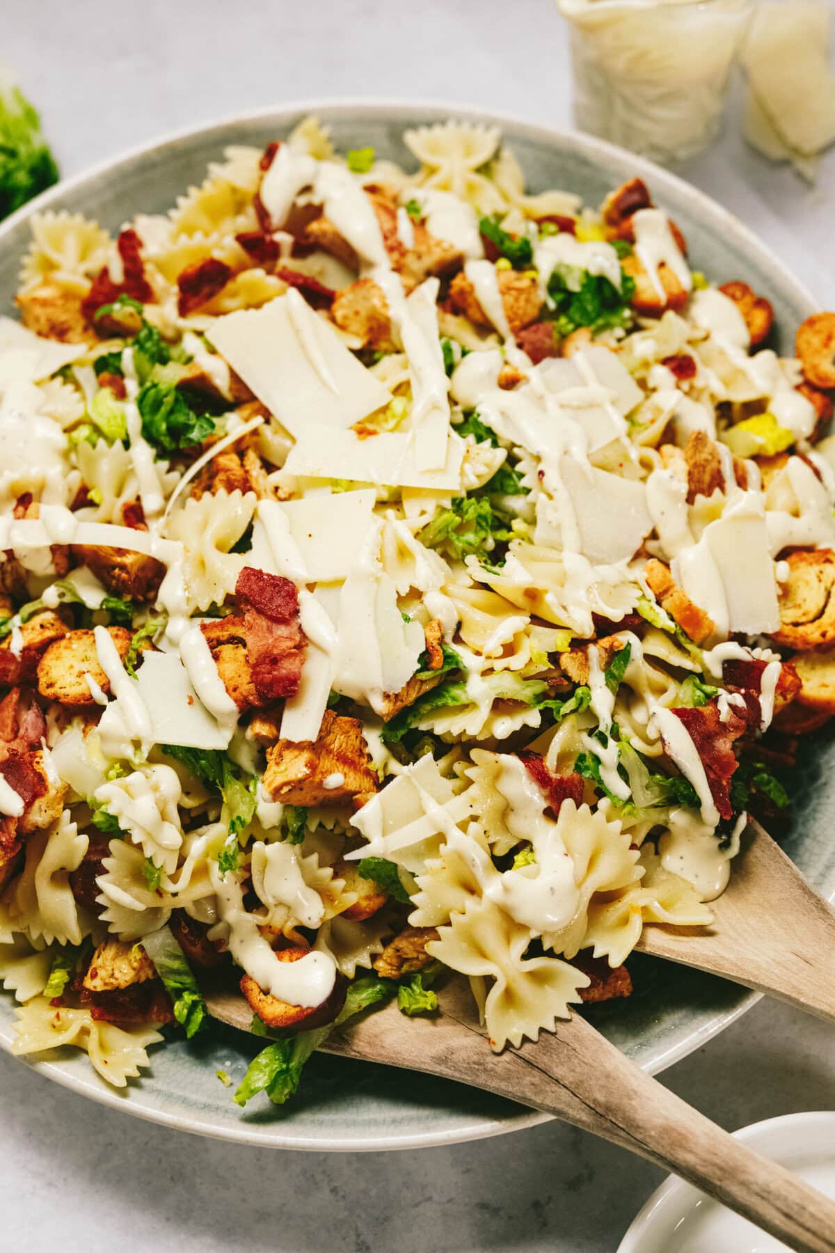 To Make Ahead: You can make this chicken pasta salad recipe a couple of hours ahead. Just keep the dressing and croutons separate until you’re ready to serve.