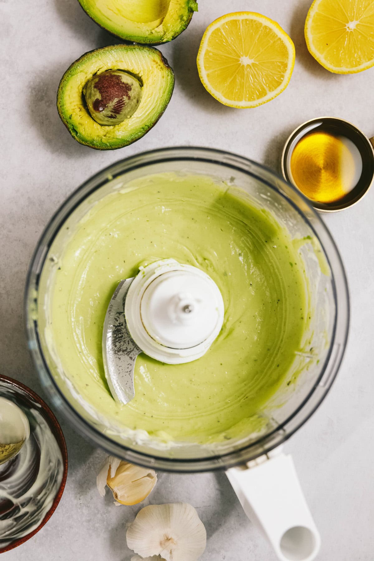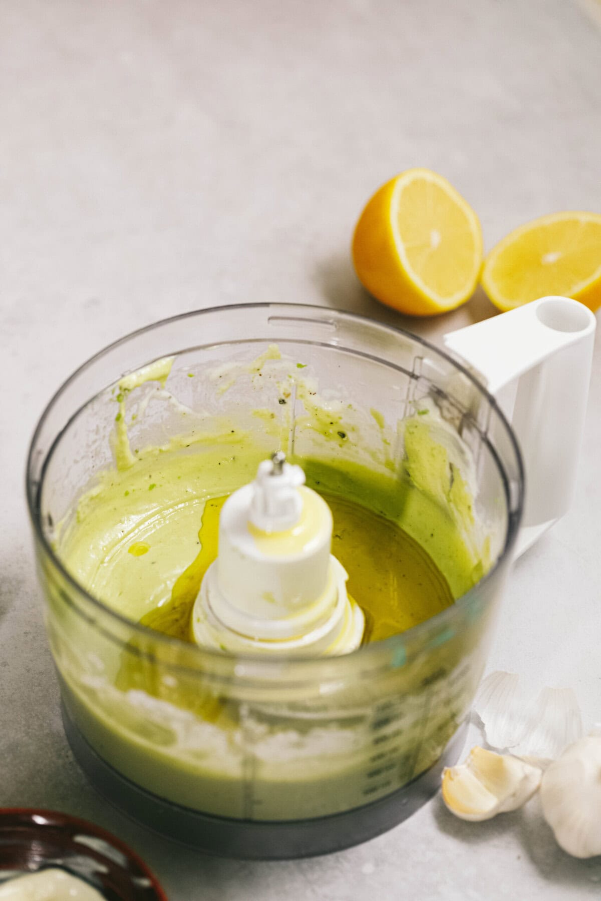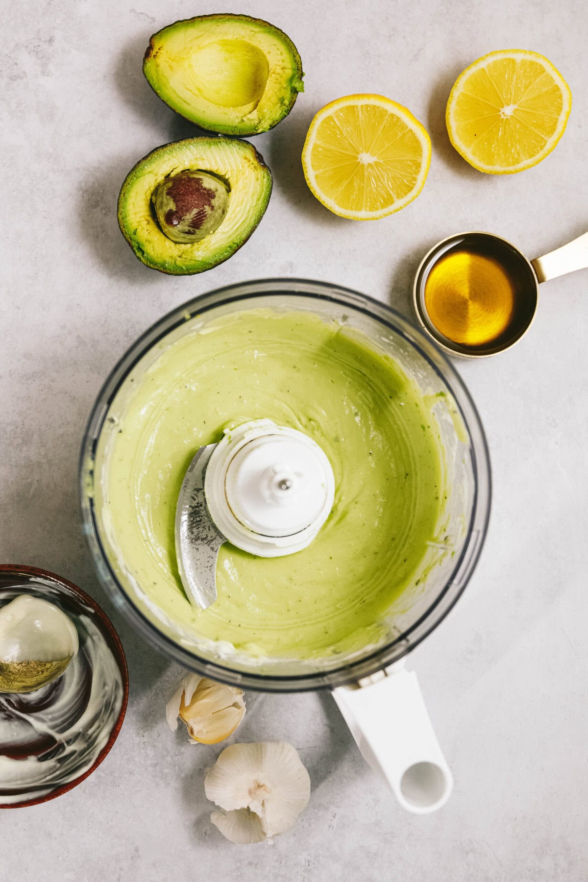 - In the bowl of a small food processor or small blender, place mayonnaise, avocado, lemon juice, garlic, salt and black pepper. Blend until smooth.
