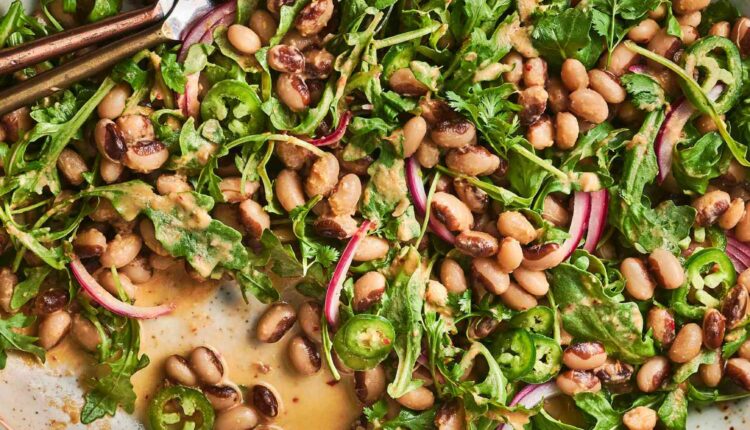 This black eyed beans salad packs some heat between the chiles de árbol and jalapeños. Feel free to seed the jalapeños for a milder version of this dish. Adding the arugula and cilantro just before serving boosts the freshness factor in the salad, and prevents them from wilting too quickly.