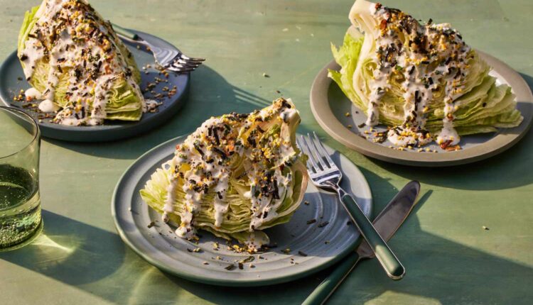 This lighter version of the classic wedge salad replaces bacon and cheese with extra crunch and earthy flavors from bits of sesame seeds and seaweed in the Japanese spice mix furikake. The dressing, essentially a coconut-based ranch, gets its body from coconut cream. For a subtle allium bite, it’s spiked with fresh chives. Make this the grand opener for a dinner party or the main event at lunch.