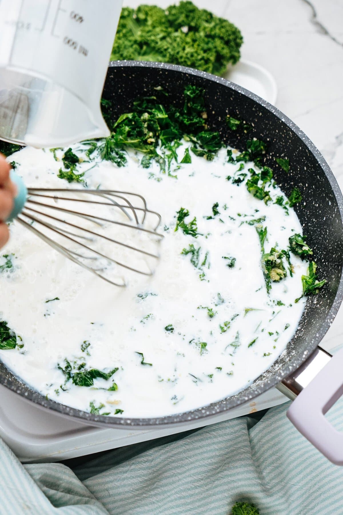 - Add in garlic and chopped baby kale until fragrant and tender, 2 minutes.